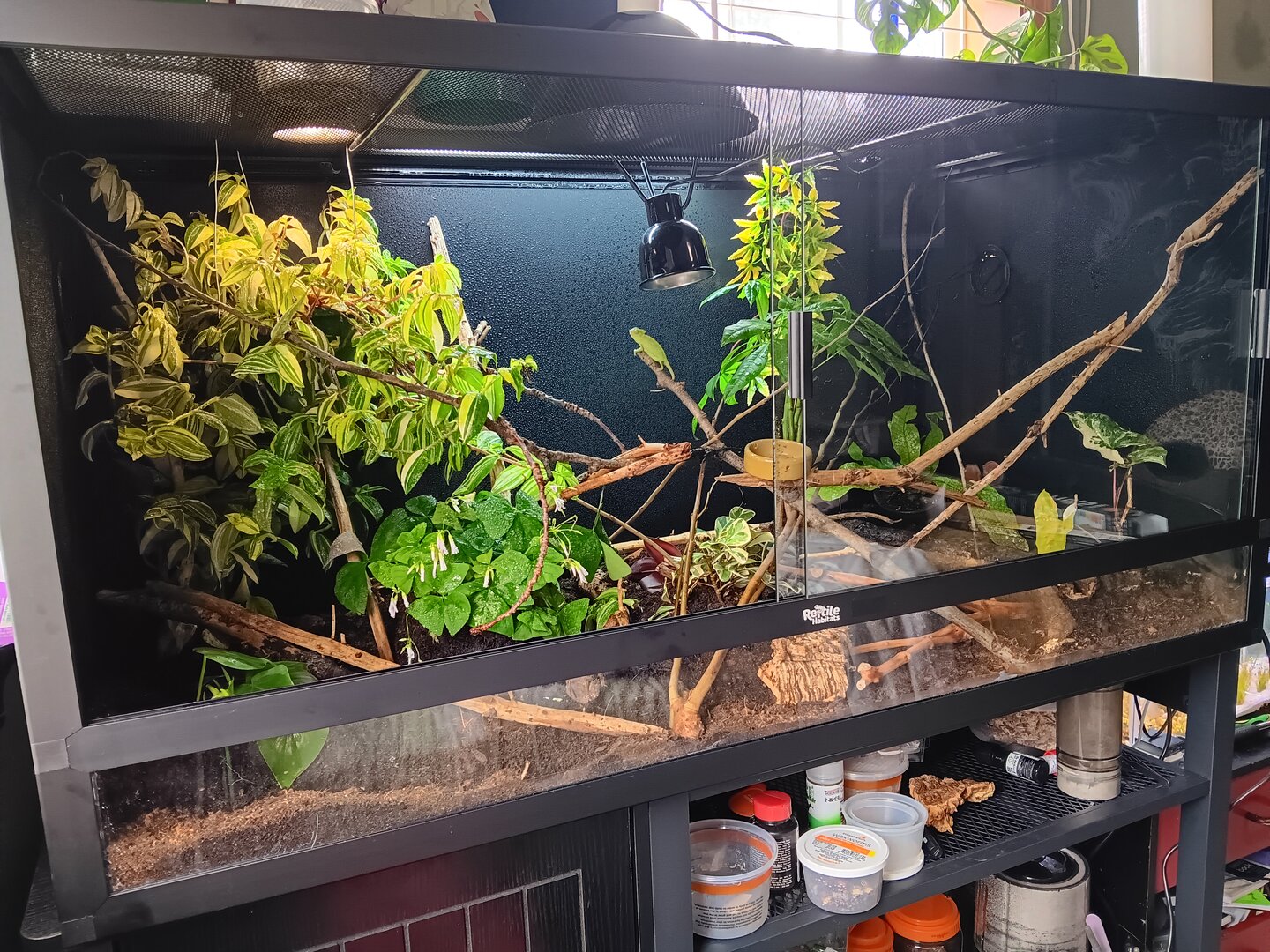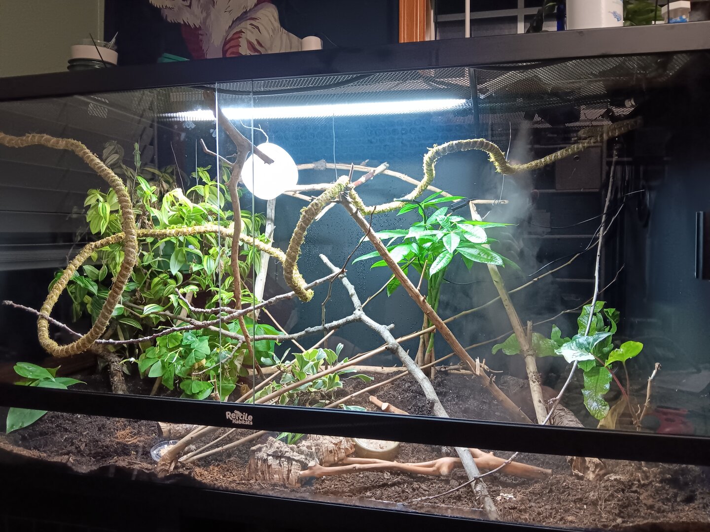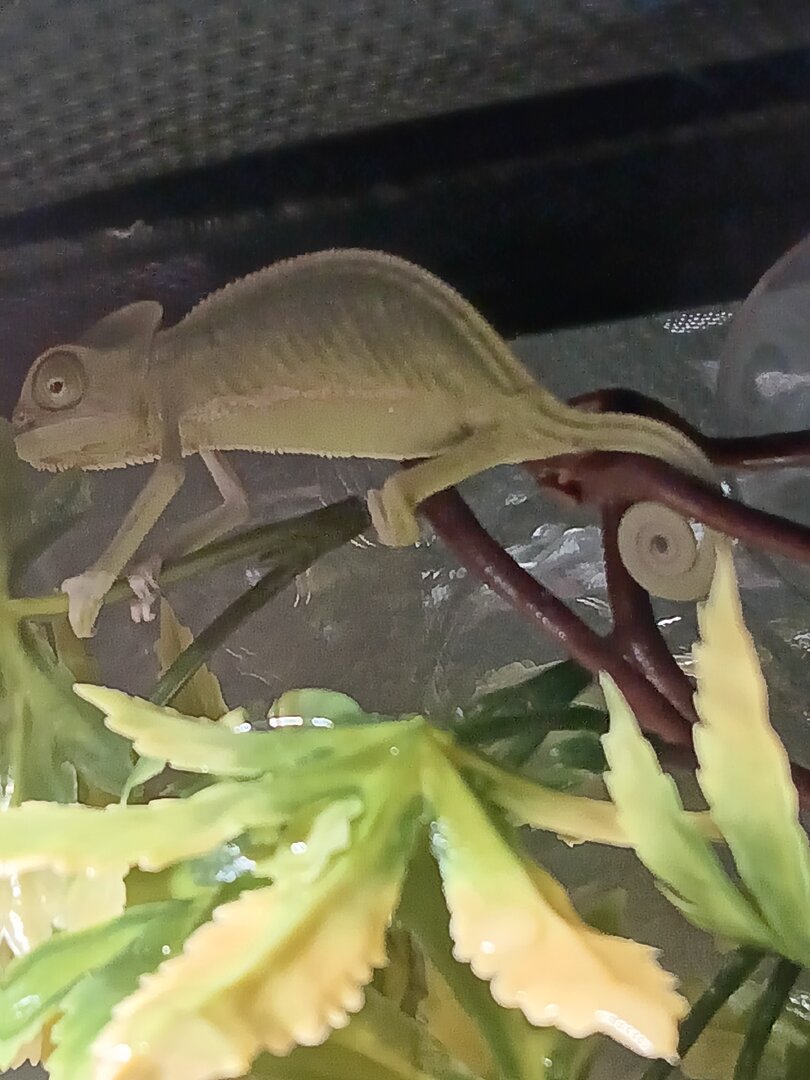 I set her up in a 4x2x2 screen/pvc cage in my room, as it is the lowest traffic, calmest room in the house. It has live plants from a list of veiled chameleon safe plants I found. There is one plastic plant in there as it is where she prefers to sleep, but I will be replacing it with a live plant once I work out how best to attach the pot to the cage wall.