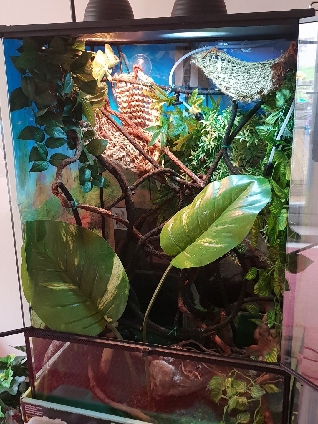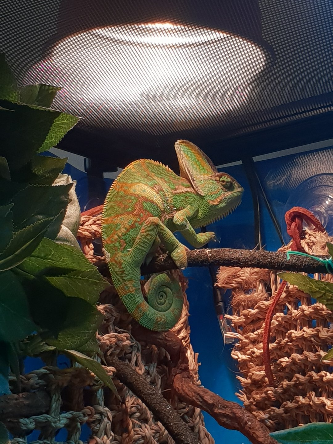 Hi all, I'd like to introduce my veiled chameleon Loki, he has been in my care for about 2 months now as my first chameleon, he seems to be doing well, originally he was never handled other than when taken out to show customers in the shop which must have been quite stressful as he was stored high in the corner away from any passers by, and only a hand reaching in to feed him and get him out, I could have chosen a more tame cham but seeing him as he was, I chose to give him a home, he is still very wary and shy but hey he's a chameleon lol, I do not handle him as he is still accustoming himself and I'm trying to build up to that part, but he is handfeeding nearly every day, also not sure of his age but I'm guessing he is not far off 8 months old now, what are your thoughts? Hopefully I'm doing things the right way but open to any advise, thank you.