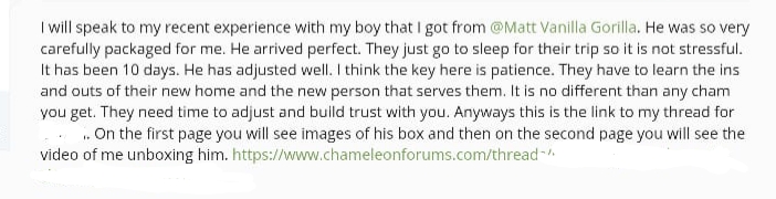 On June 25th we sent a chameleon off to a customer and that customer received the chameleon on June 26th. That customer was very pleased with the chameleon received and even voluntarily posted an unpacking video which clearly illustrated their excitement! We have that video and excerpts from all communication received, but in order to preserve the dignity of our customer, will not be publicly sharing those here at this time or any further time unless made to do so. We will however share only that which has been made public by this individual while still respectfully removing identifiers and names. Please do note the lapse of time mentioned by the customer in the one publicly shared communication.
