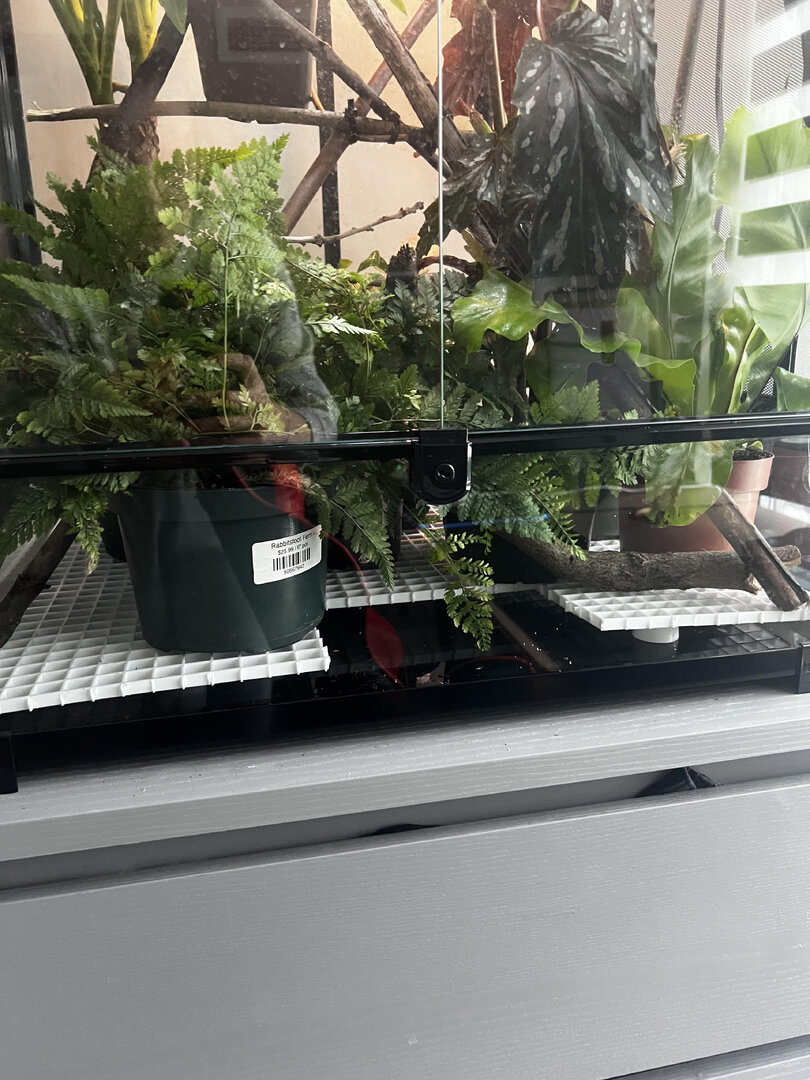 I have a hybrid enclosure and provided a lot of plants and sticks for him. My misting system goes off i believe three times a day for 85 seconds, and so far i have been using my fogger all day to try and keep humidity up but realized this might not be good for him so by tonight I'm only using his fogger at night to get his humidity to the high 80s-90s like it usually is. I got him about three days ago and he so far has not eating which i'm assuming is due to him adjusting to his new enclosure (i hope).