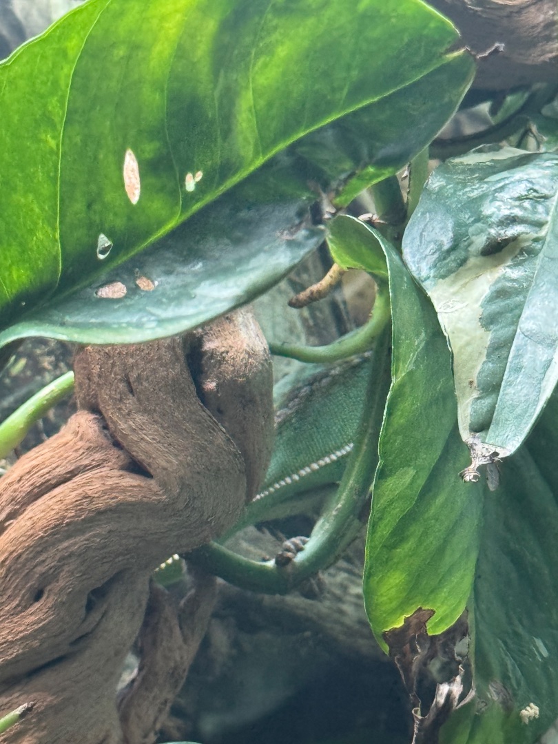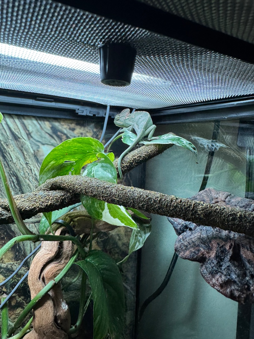 My worry is that he is being exposed to high UV or maybe is getting too close? Maybe he is too cold? His basking spot is about 5 inches under the heat lamp, however, he doesn’t really go up there! The other spot in the top left corner of his tank is a fake rock with a little food bowl that we put crickets and other insects into. He mostly lingers there, but he lays sideways at an angle with his eyes open.