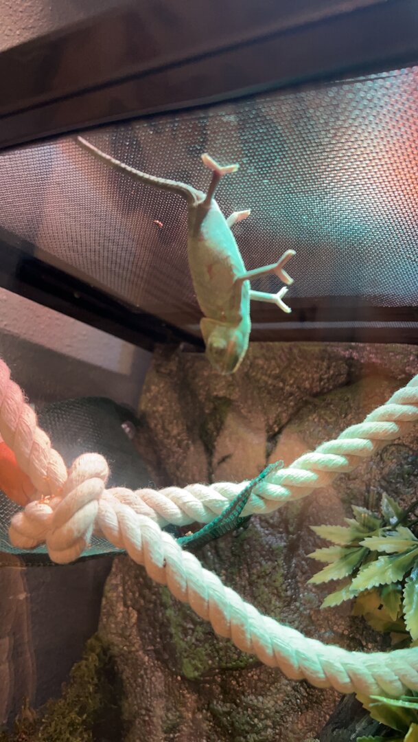 She also turned a really dark green/almost grey Color when I tried to feed her and she hasn’t eaten today. Is this normal for a new chameleon? She seems okay in the photo where she is hanging cause she was exploring her new enclosure and I want to make sure she is healthy.