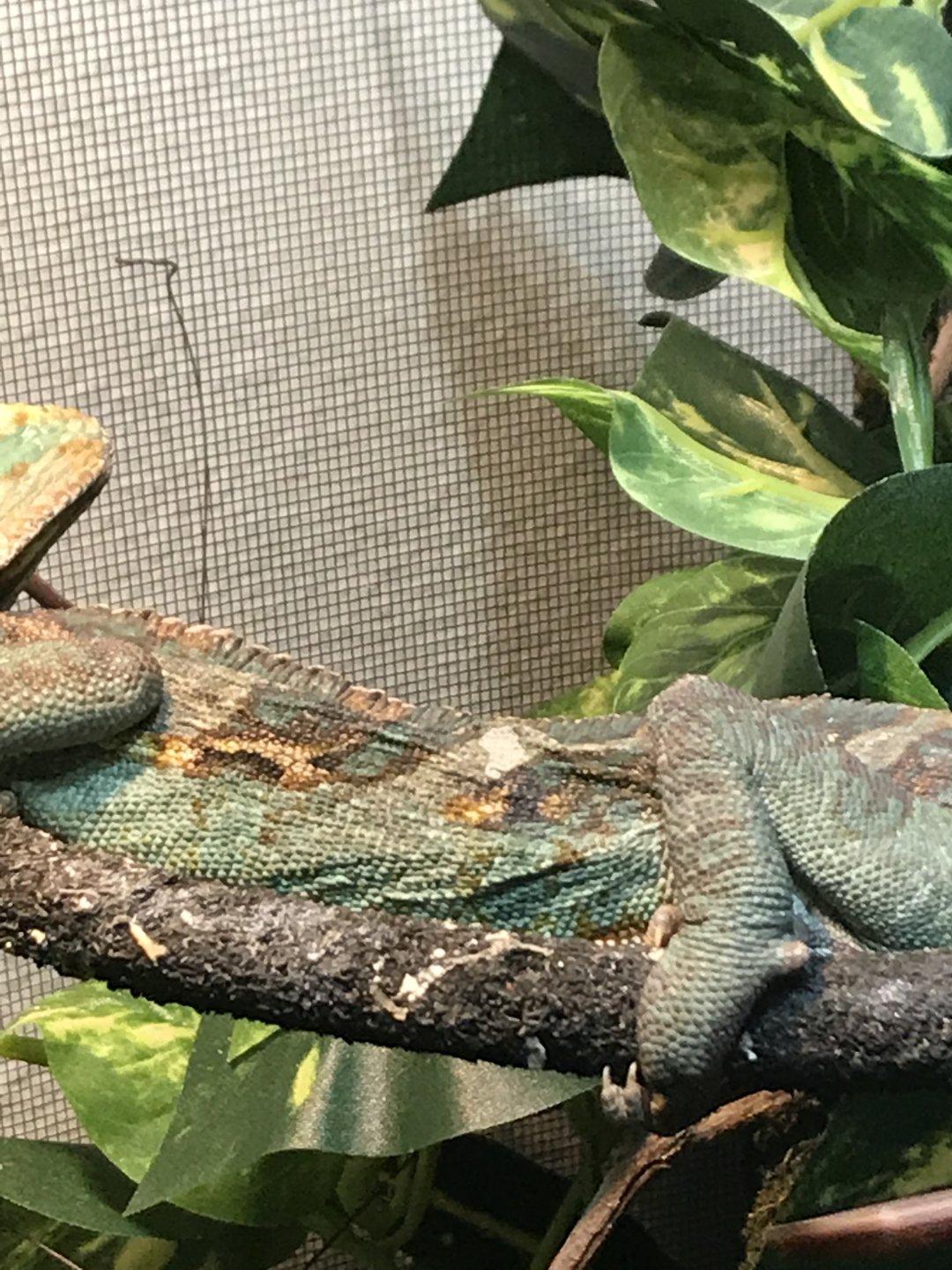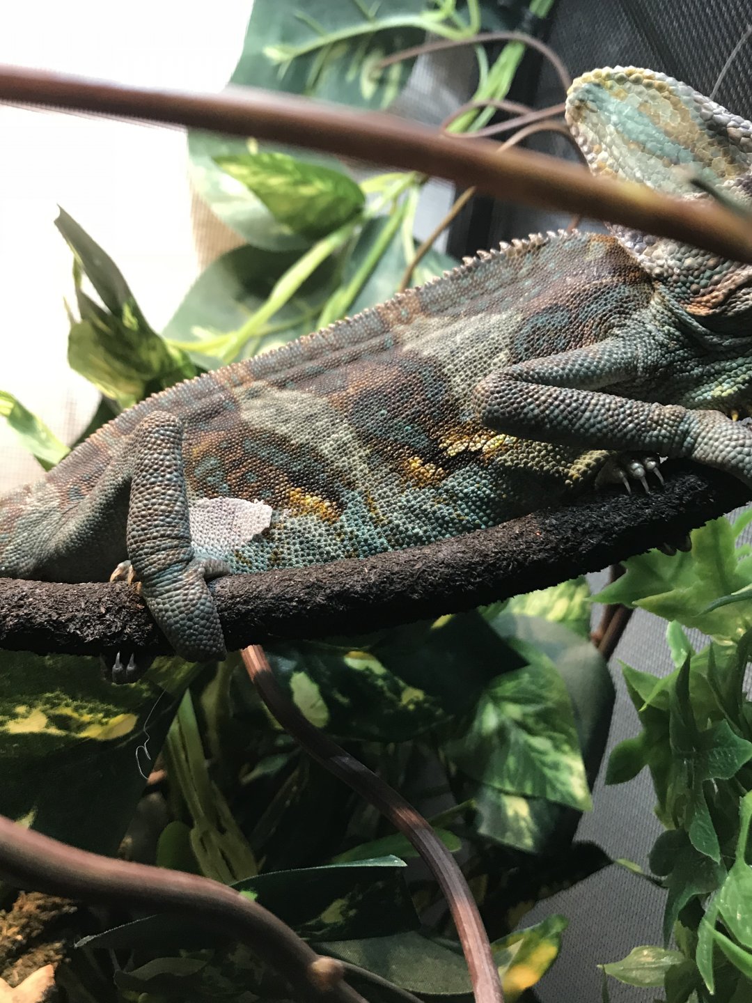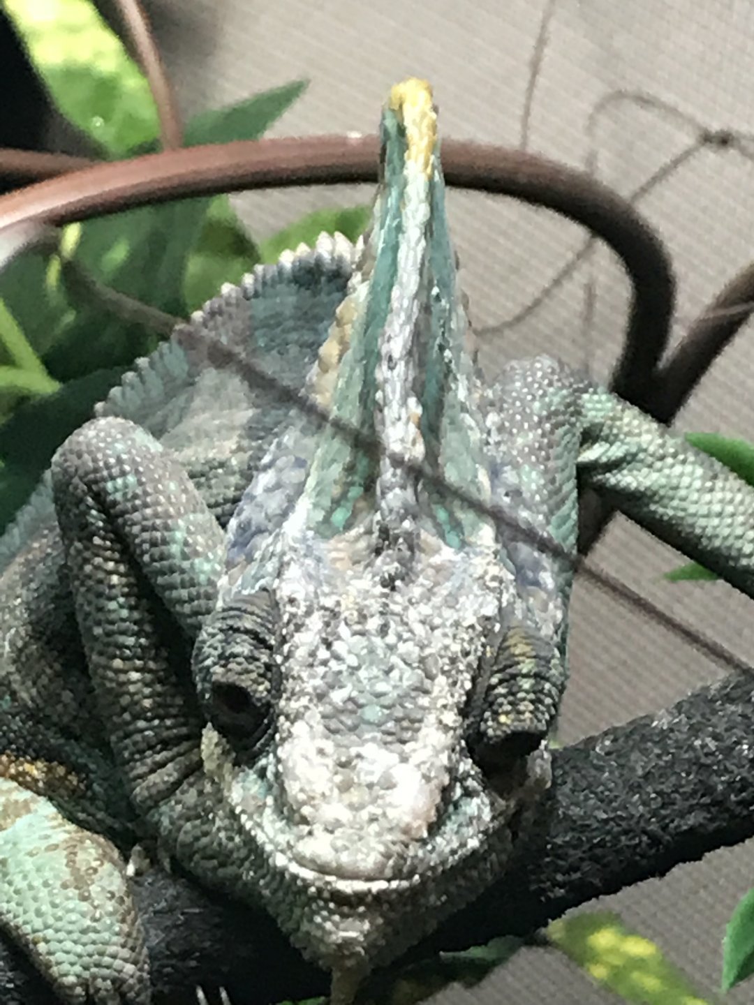Welcome to the forums! Your chameleon is a male veiled chameleon and they are notorious for having attitude. From the picture, it does appear he is going into shed. You found him crossing the street huh? Thats pretty cool. Do you live in Florida by any chance? I ask because there are some wild populations of veiled chameleons there and if he IS wild, I'd recommend getting him checked for parasites by a qualified reptile vet. If you have any husbandry questions be sure to ask. There are a LOT of great people here that would be really happy to help. Good luck with him.