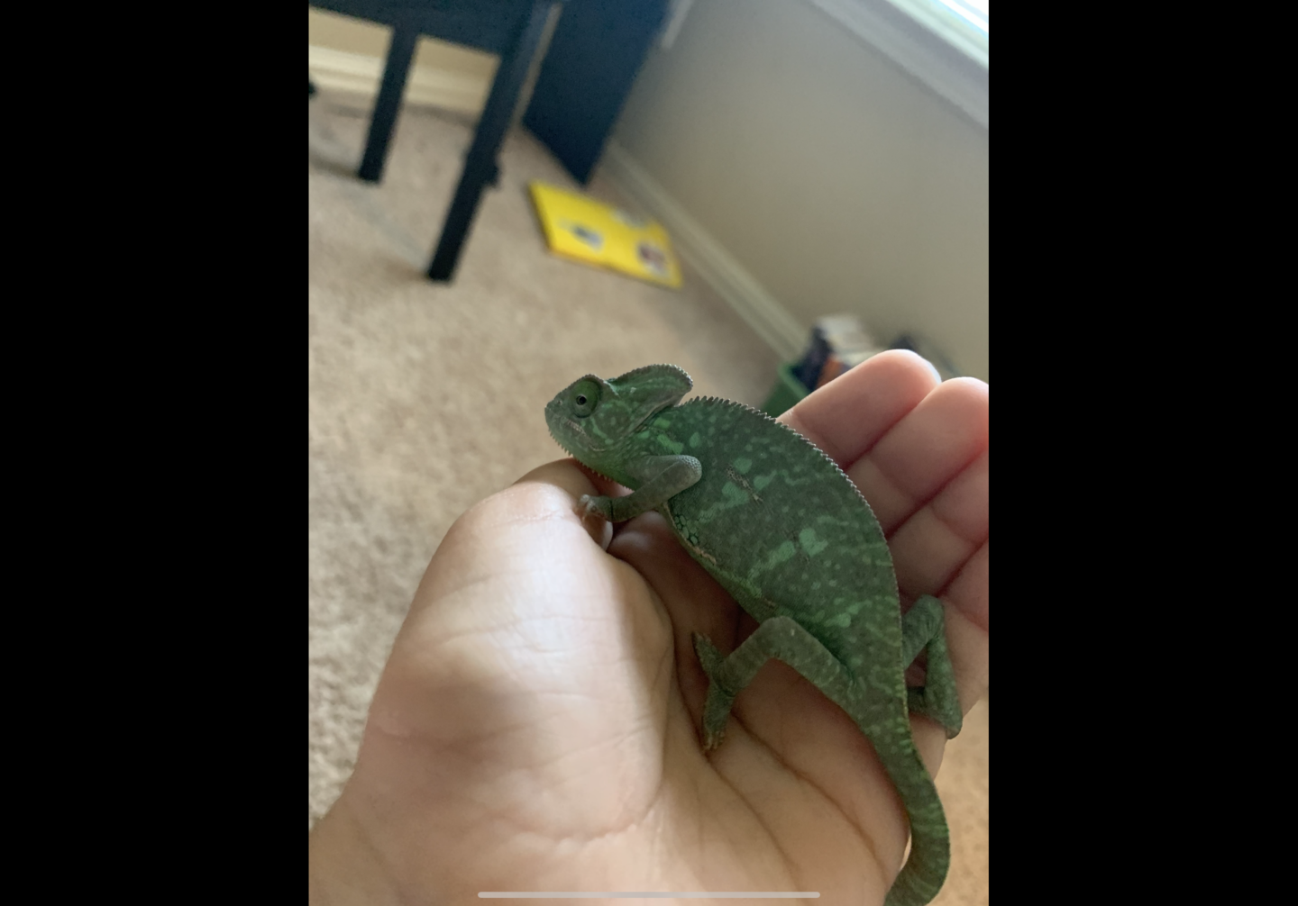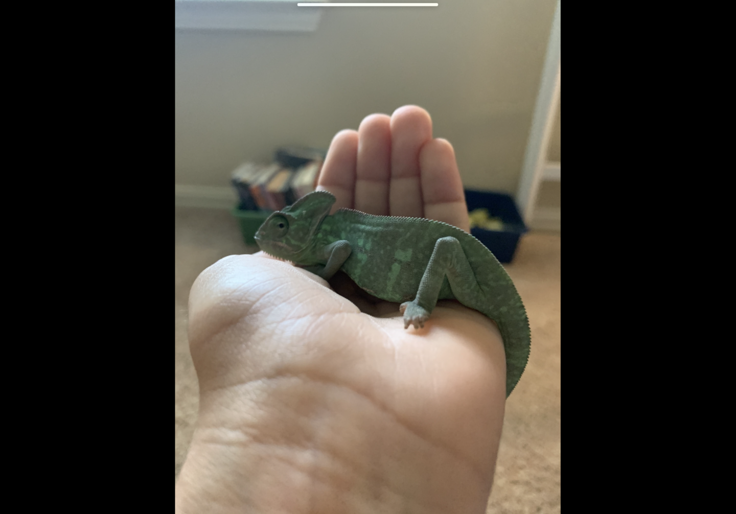 Still a bit too blurry. But so far not seeing a spur so I'm still leaning more towards female. Do you see a spur on its back legs? As for stuff for a baby chameleon, make sure any husbandry issues that have been previously mentioned by others are taken care of. Provide a nicely decorated enclosure with spaces to hide and escape the heat if needed, and both verticle and horizontal climbing branches. For feeders, crickets, silkworms, hornworms, dubia roaches, spikes/bb flies, phoenix worms, and super worms are great. Waxworms and butter worms are good for treats (especially useful for taming and handling). Make sure your feeders are not bigger than the width between the chameleon's eyes. Invest in a good dripper and mist system if desired. I have some larger palms, orchids, and various chameleon safe houseplants that I let Cleo free-range in for a few hours every day so maybe some nice larger plants for free-ranging would be good. Just make sure to remove the perlite/fertilizer and cover the soil with a towel or large stones. I learned by surprise that chameleons will go for the soil which is not good for them to eat, and now I cover the soil with a towel whenever he free ranges