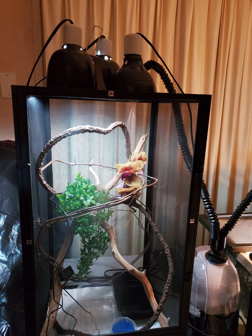 5.And the dish on the bottom is just to catch the drips from the fake orchid that the fogger gets drips and drips on that. I empty it 3 times a day so it never has water to deep in it just incase she wonders all the way down there. I said in my last post I do mist 2 to 3 times a day for drinking and humidity purposes. They say don't let the drips go all over so I try not to saturate the bottom of the pen.