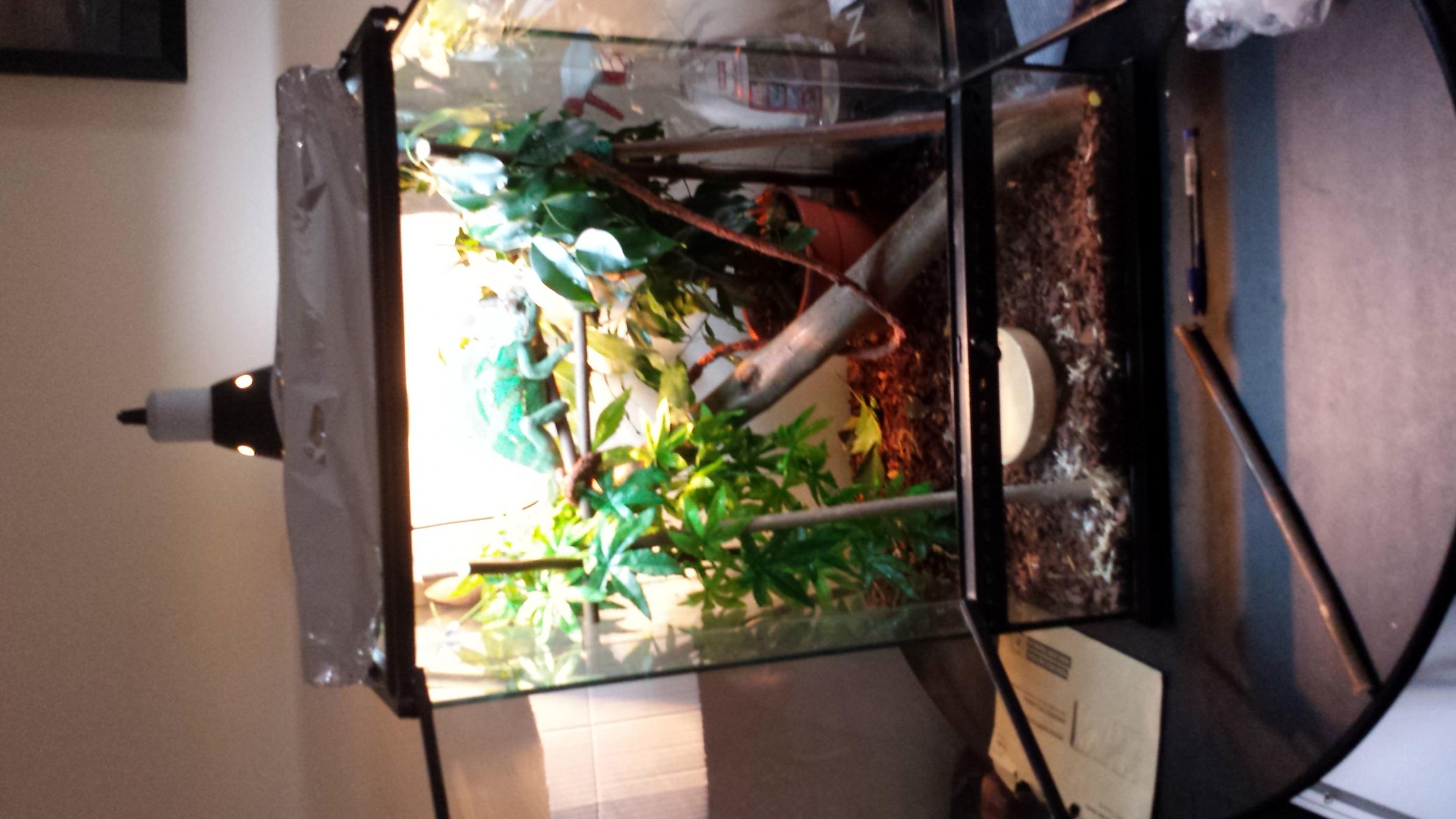My setup is a glass 600 x 400 x 400 tank with mesh roof. I have a basking lamp with thermostat set to 31°c and uvb bulb in tank.