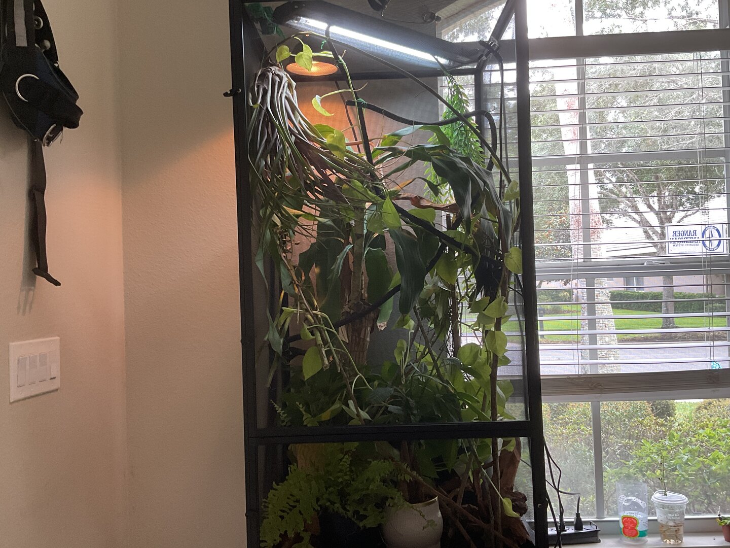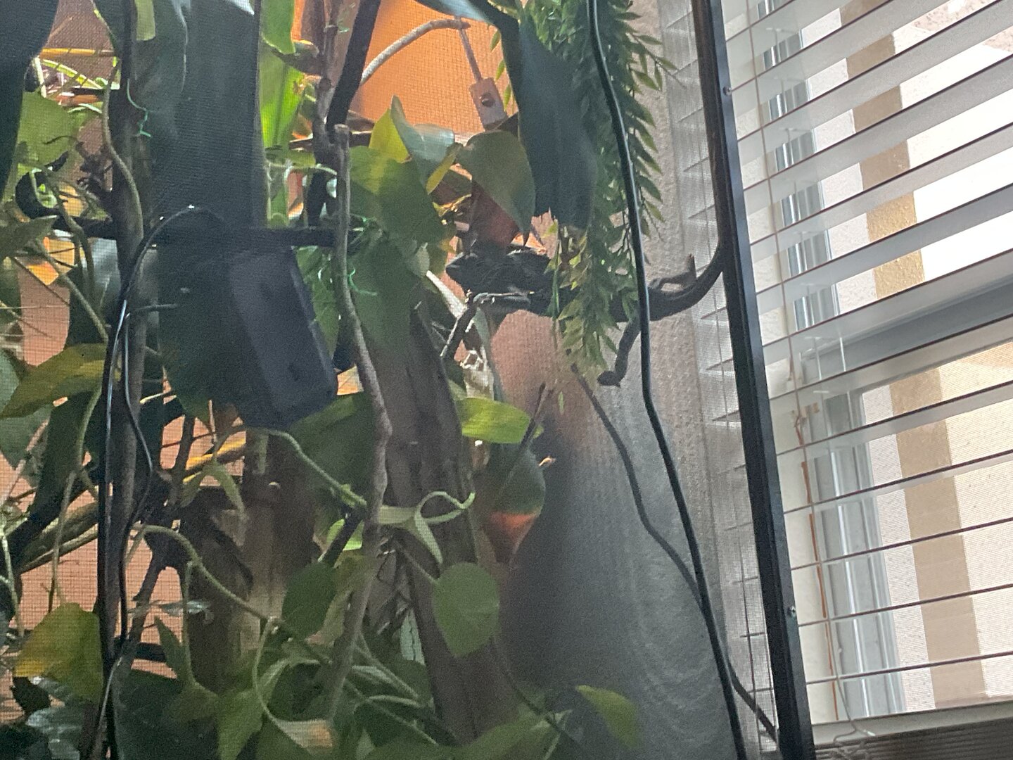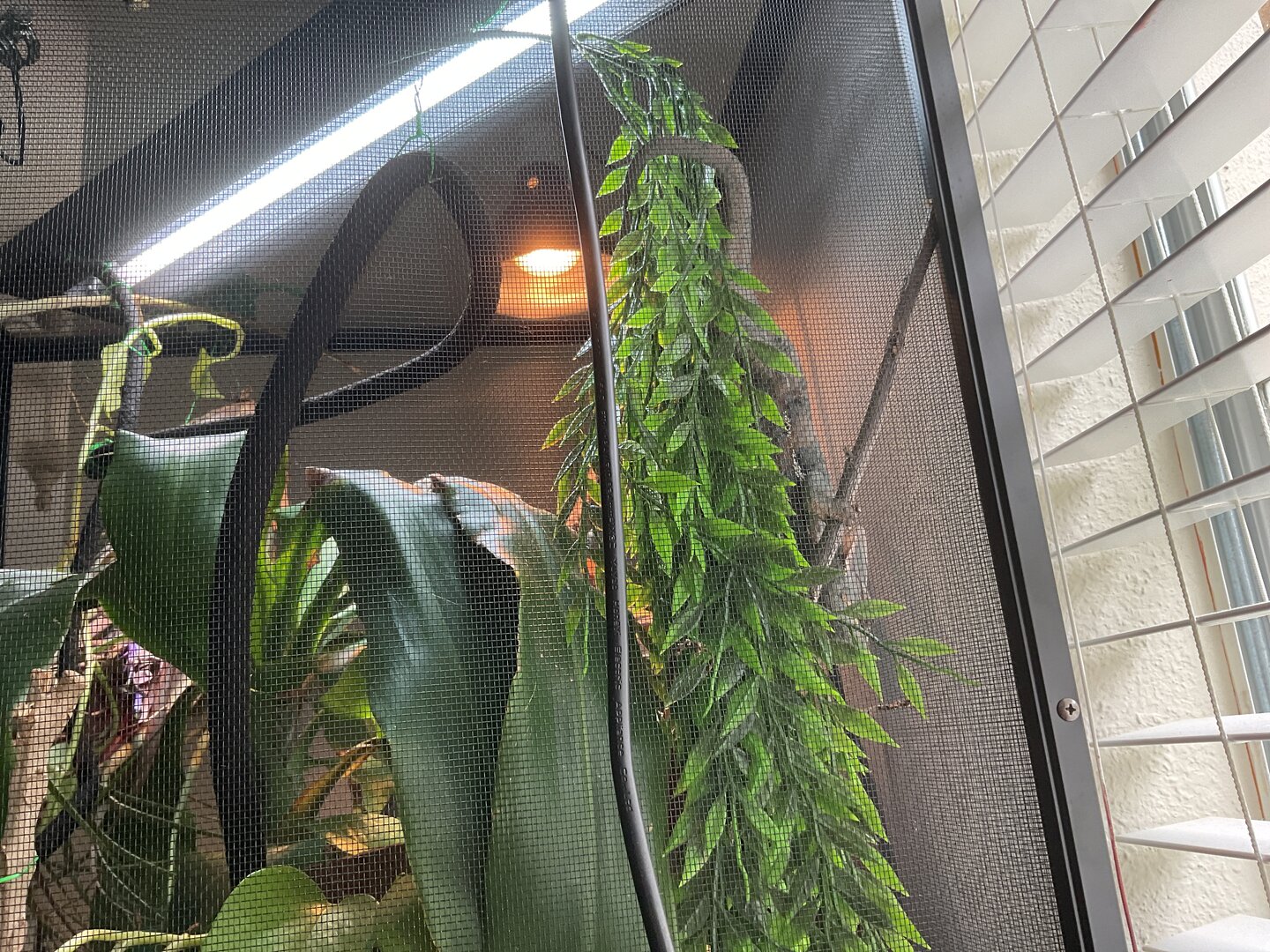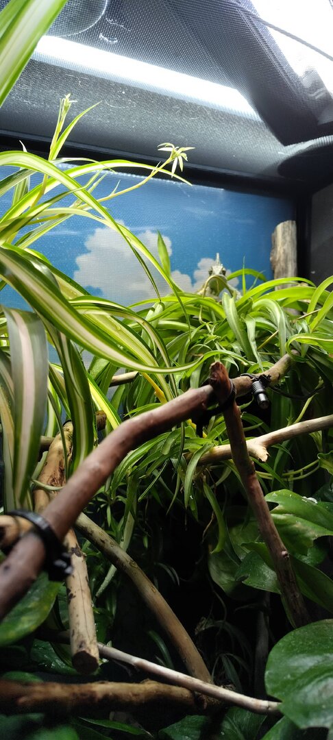 Maybe you'd be interested in hanging that on the outside of his enclosure, so he still feels some of that safety from the coverage. My enclosure is a constant WIP, but this is what I've done with my fake plants so far: