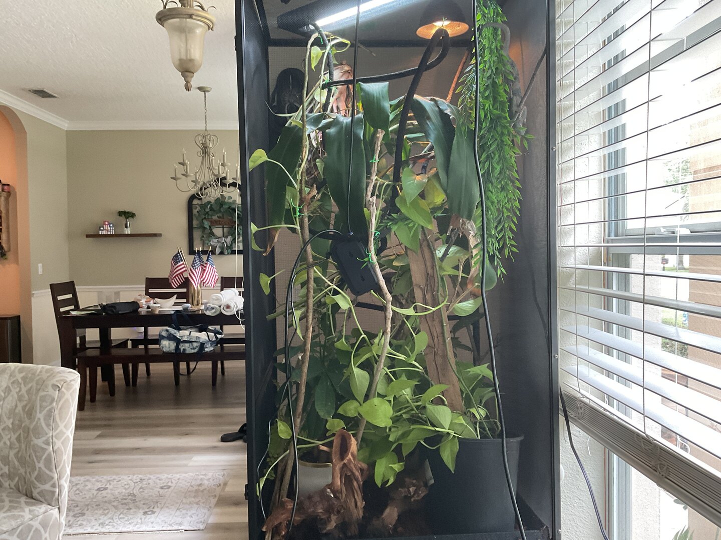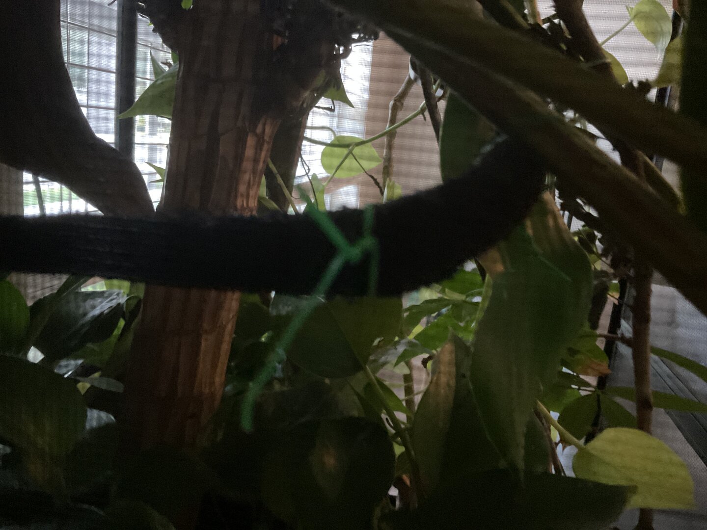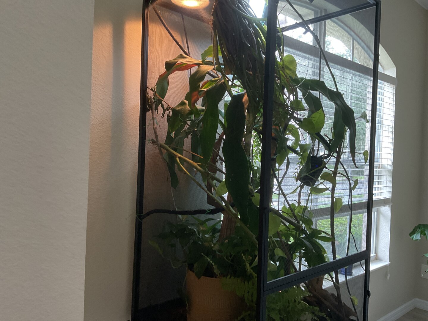 A spider plant or pothos in that same spot would work just as well! Just a suggestion. My chameleon is almost always in his spider plant.