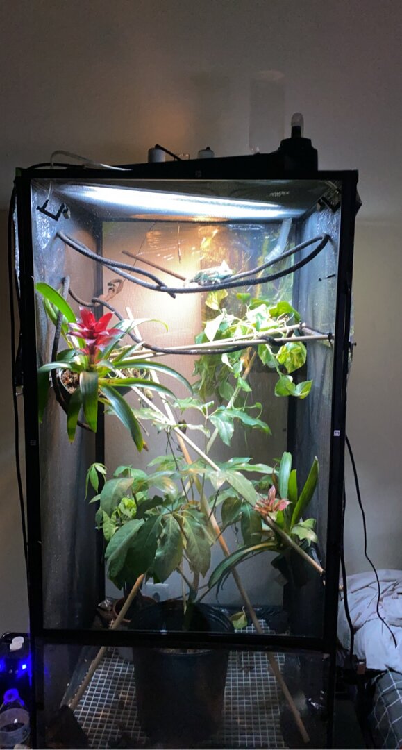 - Plants - All live. Bromeliads, pothos, money tree, and umbrella tree. I forget the scientific name of the umbrella tree but I am 100% certain it's the one that is none toxic to chams. I checked the scientific name on the label before I bought it.