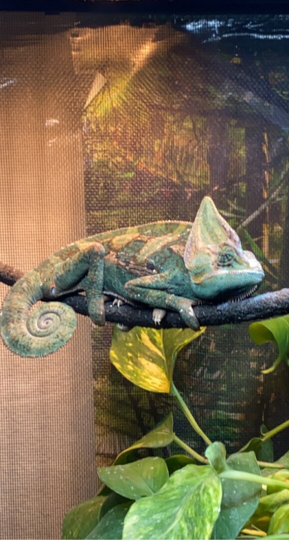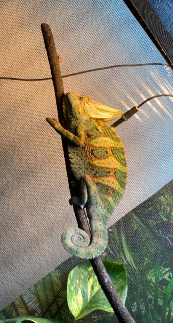 Current Problem - I want to start by saying a little over a week ago he only had calcium-dusted superworms to eat, this was only for a week though, before that he had his usual feeders. I fell on some hard times this last month and was unable to buy his normal feeders until last weekend. I'd say it was probably last Wednesday he started refusing food altogether, which at first I wasn't too concerned about, figured he was just bored of them or remembered one time when he got bit on the cheek by one of the superworms and just decided he didnt want them anymore. Kept trying to feed him the same until last Saturday when I was able to go get a bunch of crickets and dubias. Gut fed the feeders in the AM and went to feed my cham in the PM. Still refused to eat, so I started getting worried. I think last Sunday or maybe Monday he finally ate two crickets but as soon as he realized it was me feeding him he stopped eating. Like he looked at me and then went back to his basking spot and refused to eat anything else. Over this last week he has calmed down a little and eaten a little more each day, for example, today he ate one small and one medium dubias and two medium crickets dusted with calcium without D3. Much better compared to the beginning of the week when I could barely get him to eat two small crickets. However, during this last week, I noticed he seemed off. He's almost laying on his branches like he's lethargic. I have seen him move around his cage off and on but he does seem to always go back to his basking branch and just lay there. And then the worst case happened, he started closing his eyes. I was super freaked out because we've been through this before and I didn't know where I went wrong other than him being stuck to just dusted superworms for a week. I immediately went to the pet store to buy a new t5ho just in case it was time for a new one, bought a bunch of crickets and dubias, and cut the daily vitamin dusting. Kept a close eye on humidity and heat to make sure they were all correct and even started misting him with lukewarm water here and there in case something was bothering his eyes. probably this Thursday he passed a sperm plug and as soon as he did he started acting normal. But then the next day was back to laying on his branches and occasionally closing an eye. Once in this last week, I saw him close both eyes while basking but I've been checking on him pretty frequently and for the most part, only one eye is closed. I know either way this isnt a good sign and am still pretty worried about him. He does seem to also have some shed that hasn't fully come off. he shed last probably three weeks ago. But yeah thats pretty much all I've got, i read branch hugging can be a sign of MBD and im super freaked out. Probably going to try to get him into the vet in the next week just to be safe. But if anyone has any advice I'd really appreciate it. The last two pictures I'm attaching were taken at the same time, I apologize for the quality of the last one, was trying to show he only had one eye closed while the other was still open.