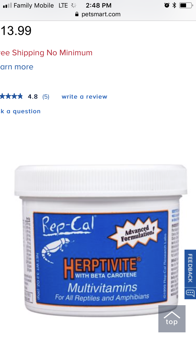 He needs some more foliage. The multivitamin is required, and can you show us a picture of him at a different angle? He looks fine, but just want to make sure. What supplements are you using right now? Are you still thinking about breeding @Cody5225?