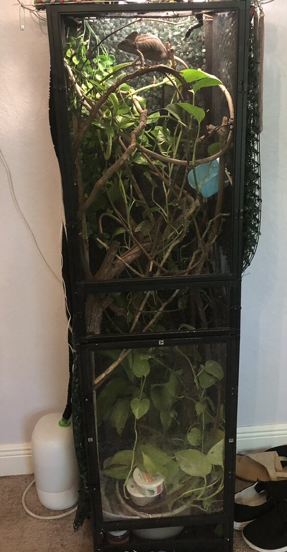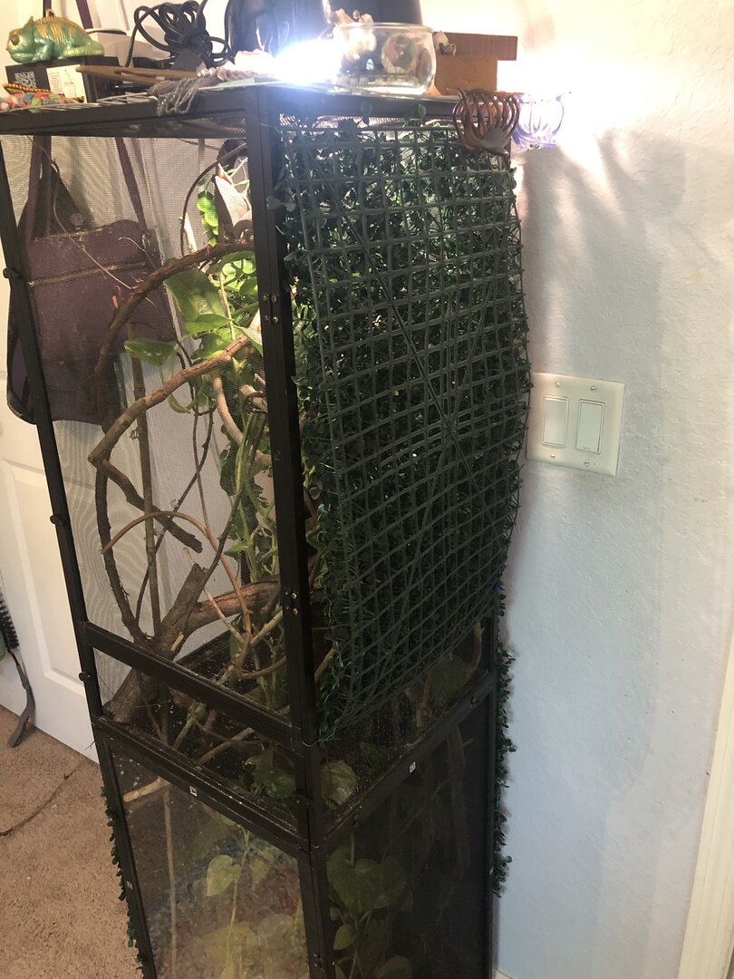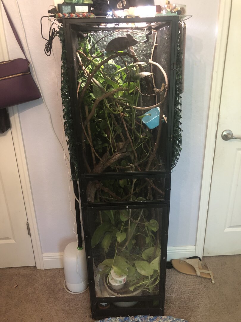 I see that it looks like you have two enclosures combined in top of each other. I love combining enclosures to give chams more space. However, I would suggest combining them side by side if you have the space to do so. I sit them on 4’ long utility shelving units which have been the perfect size and the ends which stick up just a tad, have helped keep the enclosures together snugly. Although I did have to get out the angle grinder and cut the ends down on one later bought unit. I use thin wires to connect them together and for the gap between where the rounded screw heads meet, I have substituted flatter screws and then sunk them in to reduce the gap. I have even tried/use tiny little hinges to connect my two together. This is a fantastic DIY that may help. It came out after I had started combining mine and have just gone with my own way. This may also help in managing drainage. https://chameleonacademy.com/diy-drainage-trays/