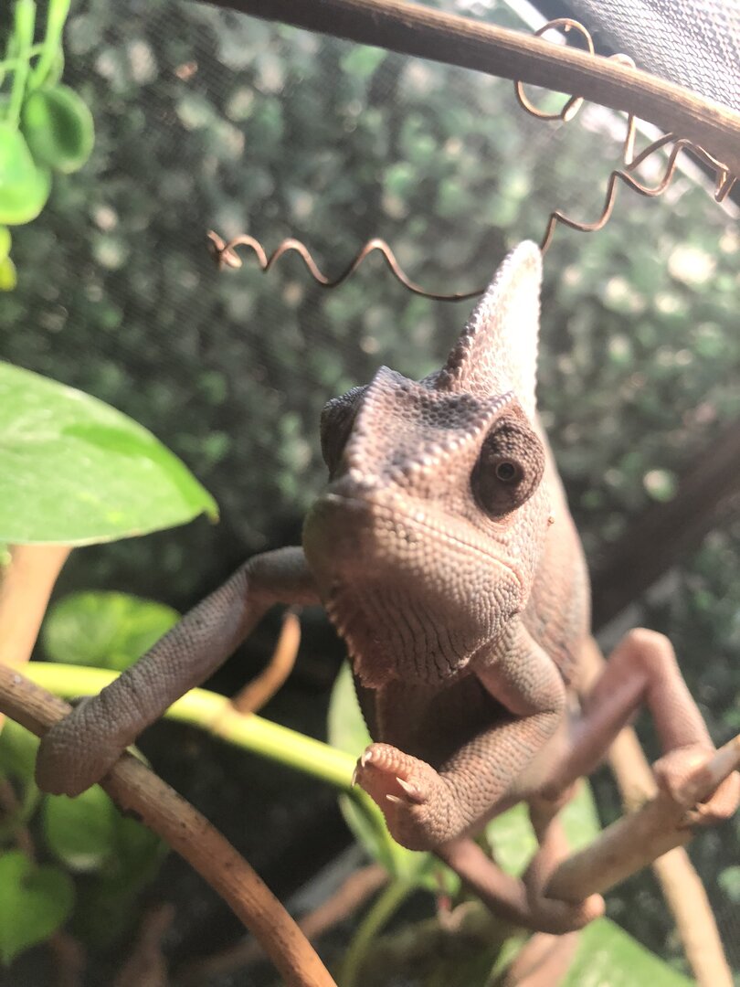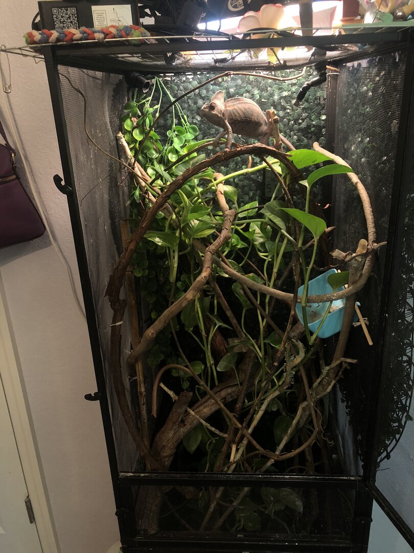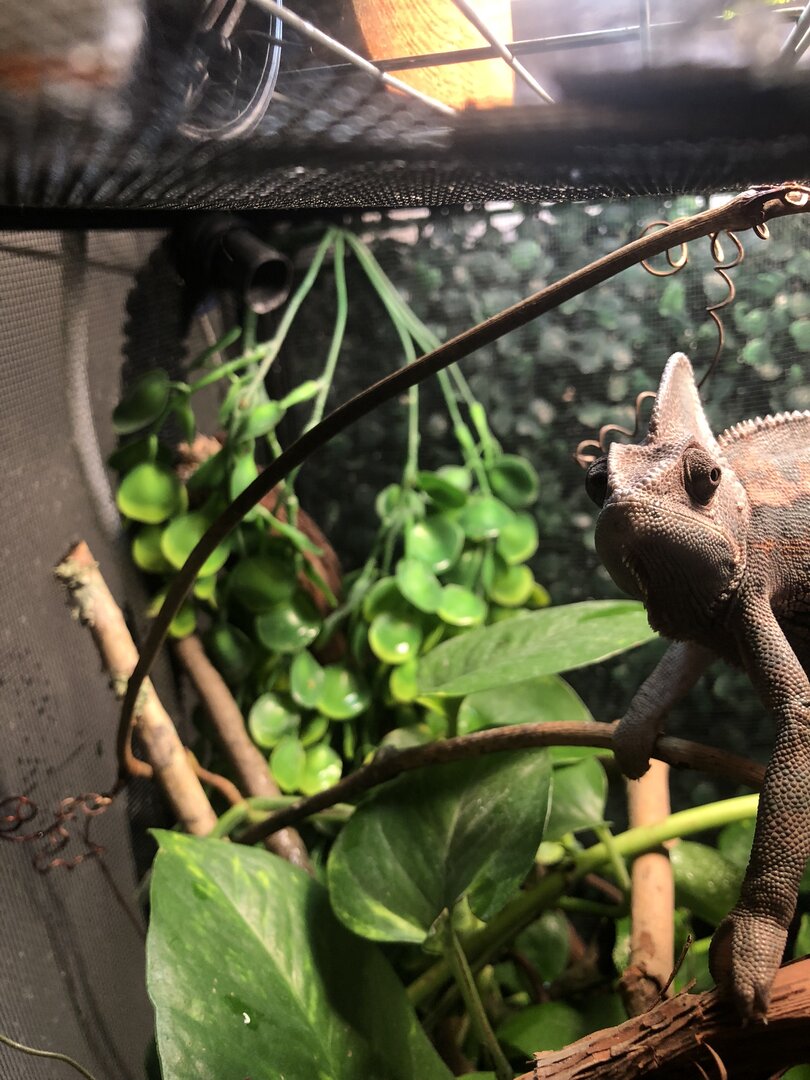 I have had my male cham for about 6-7 months and I am wondering if he needs any upgrades. I got a proper fogger around Christmas and have had a mister the whole time. He has a compact uvb I know I will need a bar soon so he will be getting that, he also has a heat bulb to keep his home at about 75 to basking 80 at night its about 60-68. the black hose in the second pic is his fogger