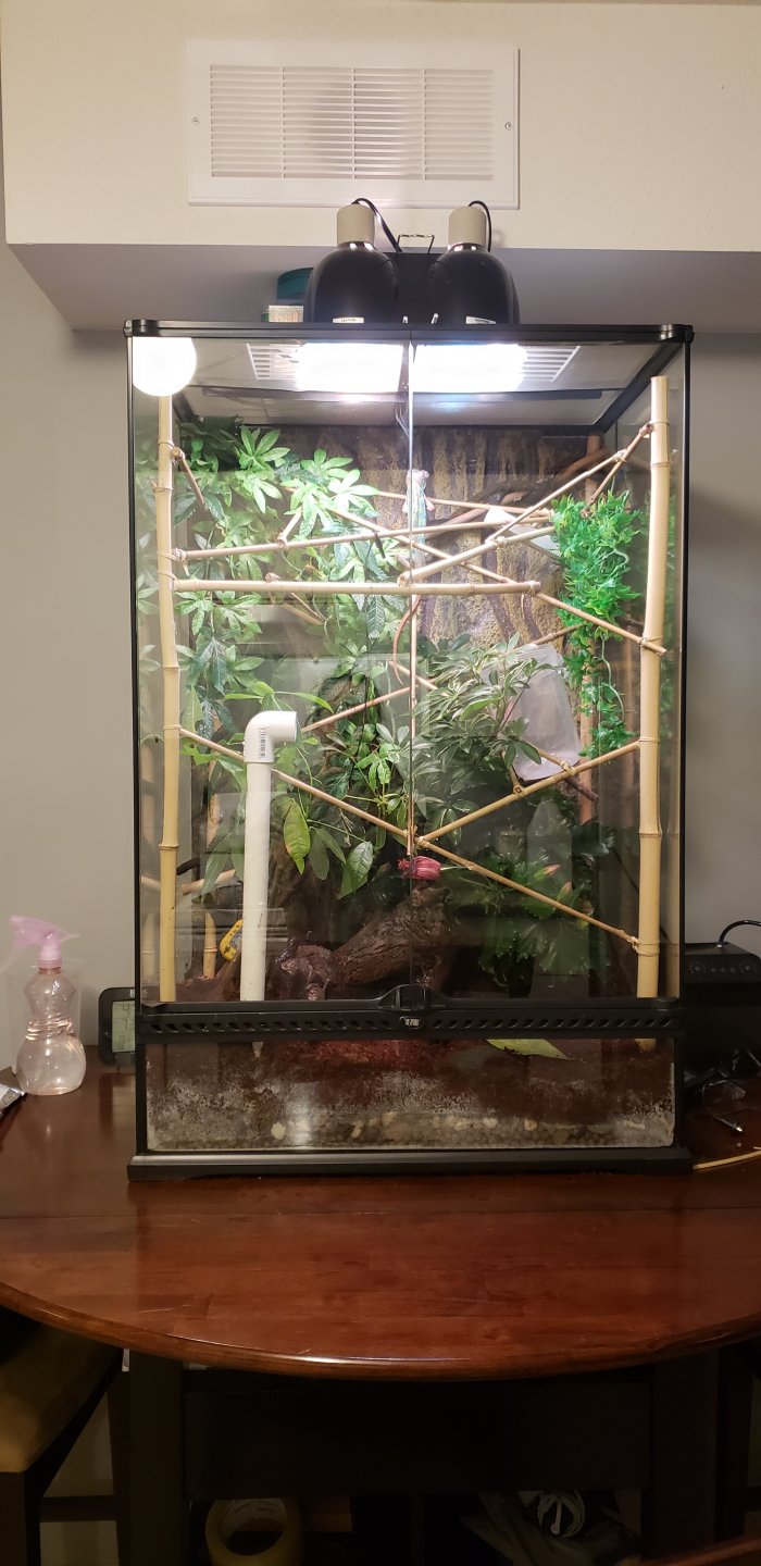 So, I put boiled pebbles, and hydroballs on the bottom along with an unfinished drainage system. I have added the mesh layer and have added some organic soil and plantation soil from exo terra along with a little exo terra bark. I can add more soils if necessary... I have planted a hibiscus, an umbrella tree, and one other that I forget what it is called, but I know it's one of the best for chams. Anyhow, is there any way I can improve? I have not ordered any isopods or springtails as of yet. Do they have to be a special species for each bug? Do they have to be tropical? Also, how will I know if the ventilation is okay or not? Thanks for your input. Much appreciated....