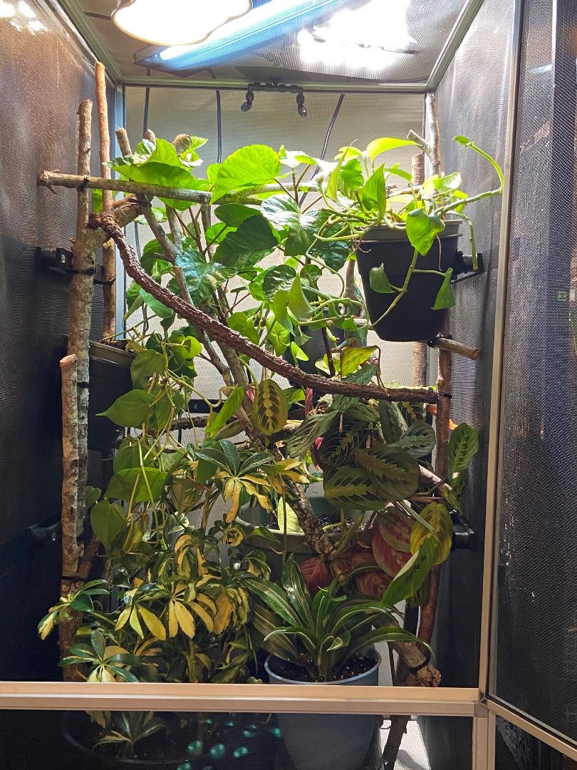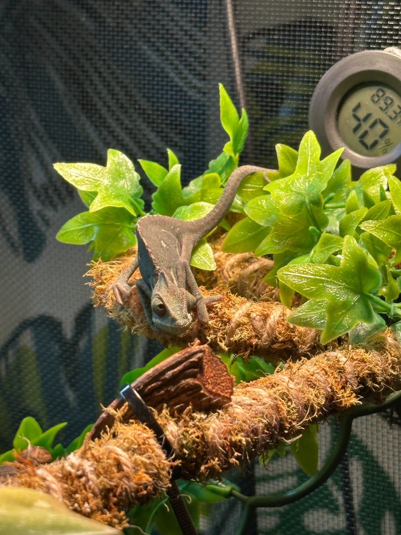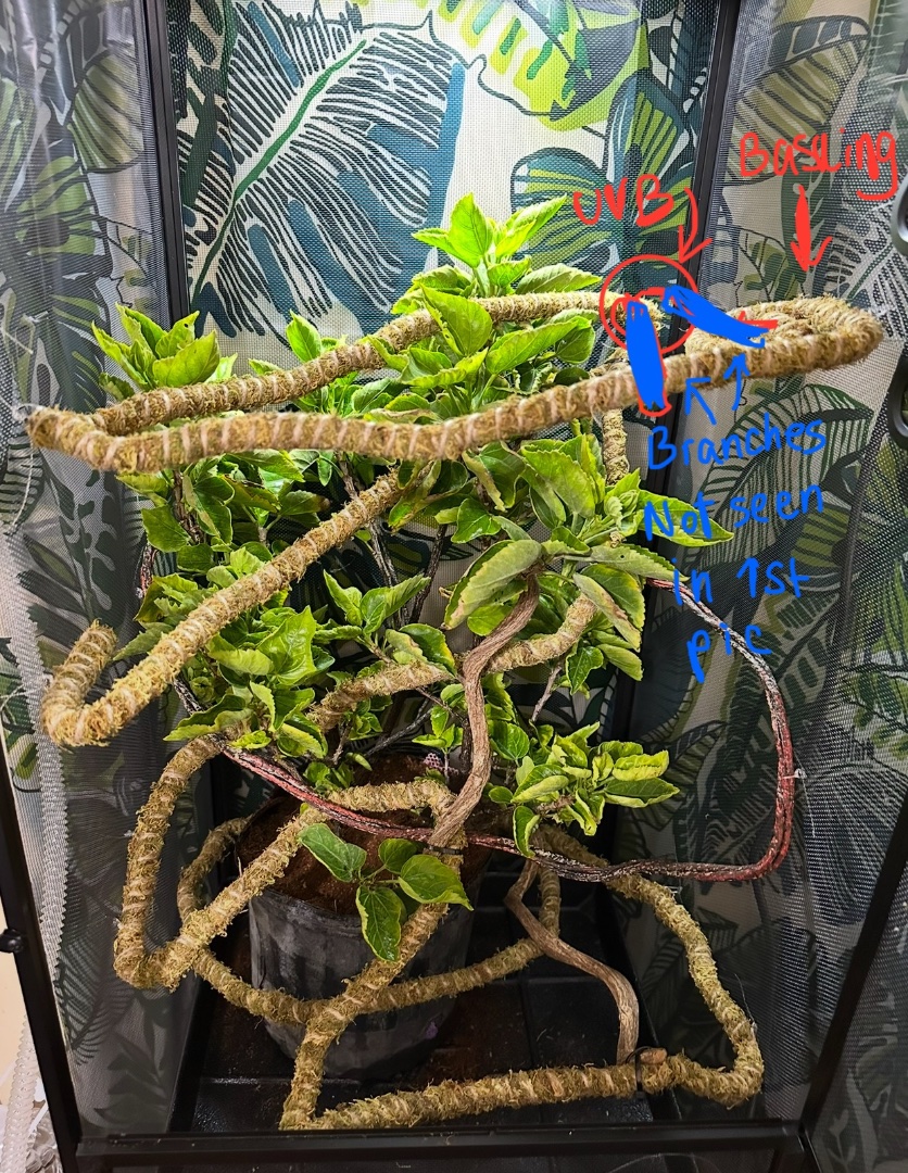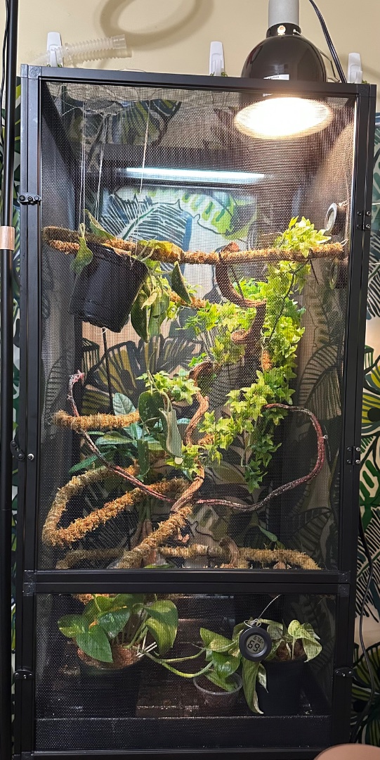 He’s in a large repribreeze cage right now. The image is the older one with the hibiscus plant (haven’t taken an inside image of the current one yet 😅) but there is a vine that’s towards the back under the UVB light with two real branches connecting it to the basking light. I’m getting more branches since it become very apparent he’s tinier than I expected he’d be 😭. Both basking and UVB light are 8 inches from the highest point (but I’ll be moving the basking higher after ur previous advice about the temperature). Do you have any suggestions on what to switch the vines with? Anything that wraps around? Or are branches the absolute must? (Also, I love how yours look!)