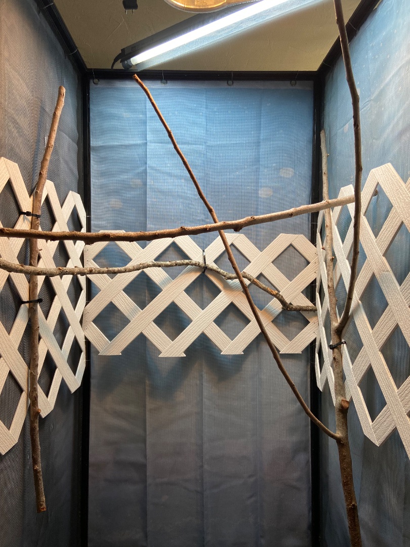 While it’s difficult to truly determine size, it does appear that you have a smaller enclosure. While it may be suitable now while he’s itty bitty, he is going to be a big guy before you know it and be needing much more space. The minimum size for adults is 2x2x4’ (like a ReptiBreeze XL). To get on my soap box for a minute, if you can go even bigger than that, do so. I’m very fortunate to be able to give each of my chams a double wide and it’s wonderful seeing them use the space. Pic below of the size difference between the XL and Cham kit ReptiBreeze (I think is 16x30”). Yes, that was when I was starting out, learning and making changes. 🙂 The black cross pieces are Dragon Ledges, which help immensely in hanging branches and plants. https://dragonstrand.com/dragon-ledges/ I’ve lately been using garden trellis and it works almost as good. The whole idea is to use the frame of the enclosure to bear the weight.