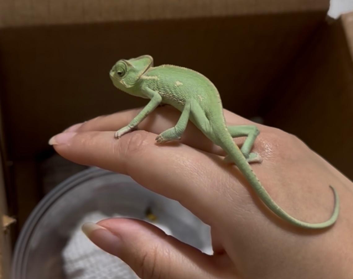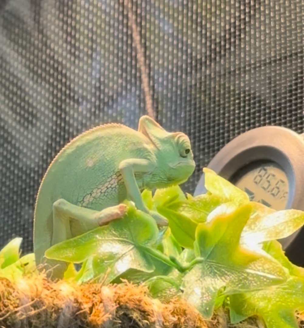 This is day 2 with this lil guy, think he’s supposed to a 2 month-old veiled chameleon. He’s only eaten 1 cricket so far but I kinda expected that, and hasn’t drank water yet but I’ve misted him.