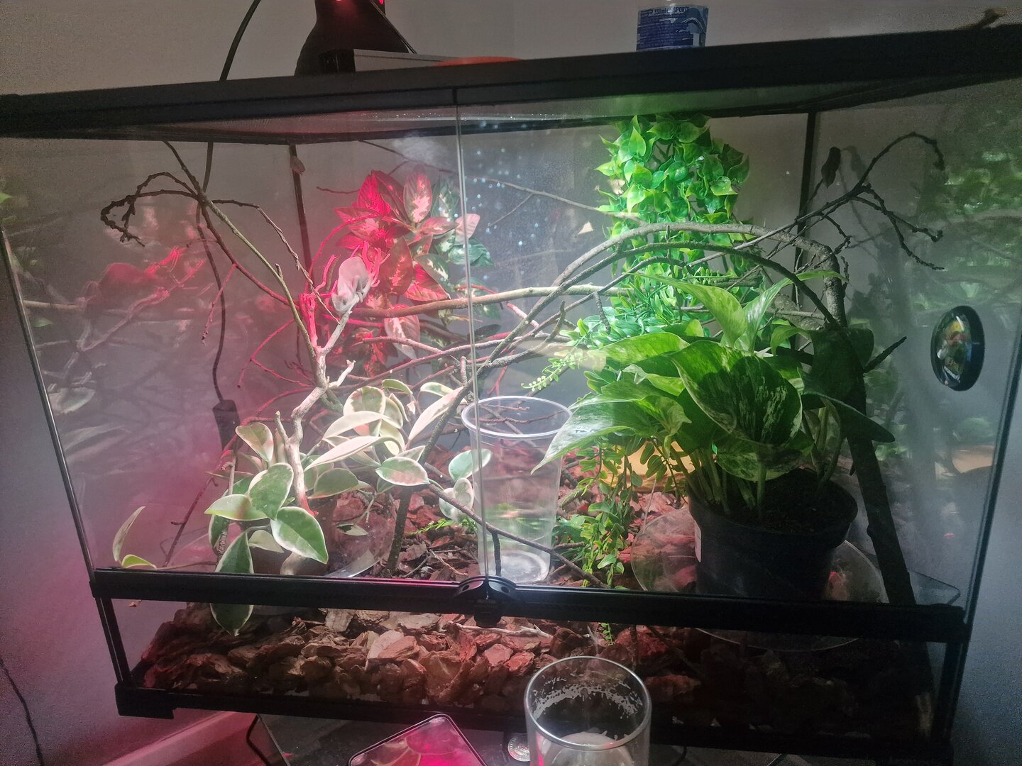You can remove the bowl. They do not drink from standing water. Are you hand misting? May I see a picture of the entire enclosure? Are you using analog or digital hydrometers? What species of chameleon is this?Yea so i mist in the morning about 30 mins after the lights go on and in the evening about 30 mins before the lights go off. Each misting lasts less than 2mins.