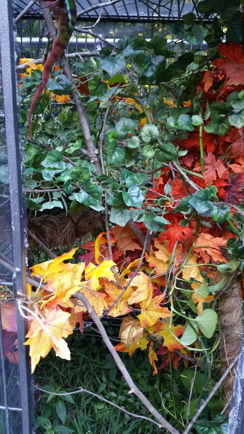 I finally finished my outdoor enclosure. It's a repurposed bird cage. I got 2 of them at a garage sale for $50 each a few months ago. It's approx 3x4x5 ft. I disinfected it then wrapped it in screen. It has branches from the yard, several live plants and lots of fake vines to give additional coverage. I made a dripper out of a new, never been used 5 gallon bucket that sits on top. Next year I'm going to plant a hibiscus inside of it. It has great afternoon sun. I think it looks pretty good, what about everyone else. I'm always open to constructive criticism and suggestions on improvements.