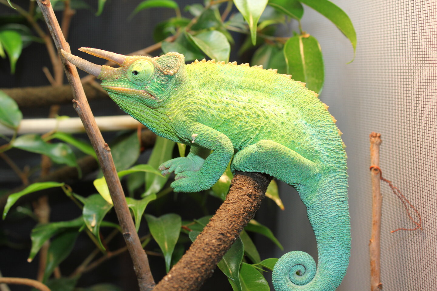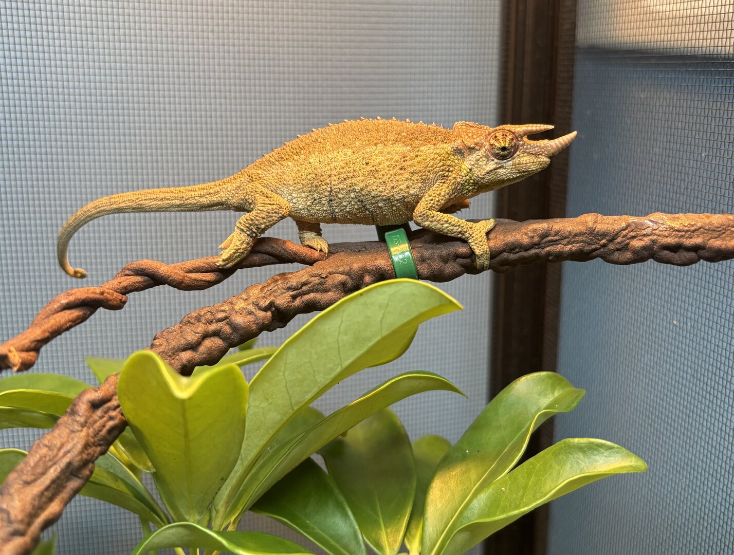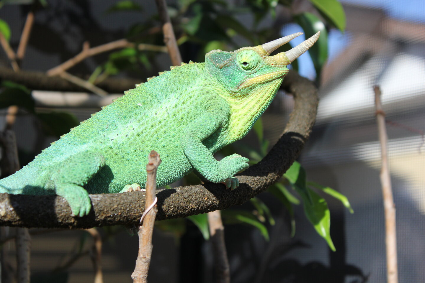 - They are very passive communicators, many other chameleons will get big and gape at you if you are stressing them too much. Jackson's don't tend to do this, the stress for them is still there but they tend to just hunker down and wait for you to eat them. Pay very close attention to very subtle body language. For my boy, if I'm messing in his enclosure too much and he is getting stressed he will squint his eyes. When I see him do this, I back of. Because Jackson's are passive in their communication, people often think the Jackson's is ok with handling and hold them often, DON'T DO IT. I only handle my guy when I have to adjust something in his enclosure, when he is going to the vet, for a physical check and weight, or when I'm taking him outside for supervised outside time.