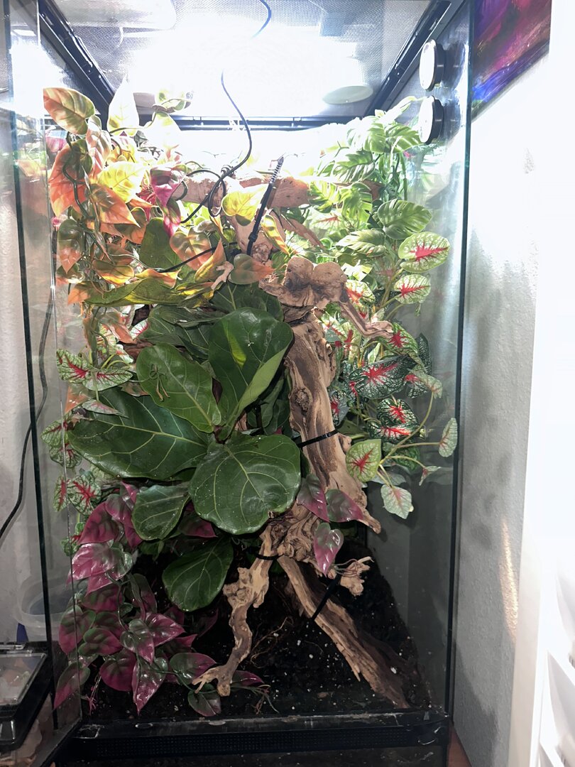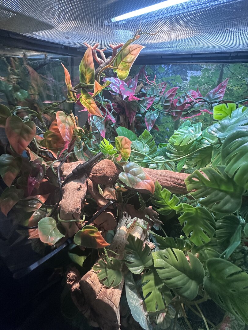 Foliage: Ficus plant, 4 pieces of wood varying in shape and size, 6 fake plants with outdoor free roam.