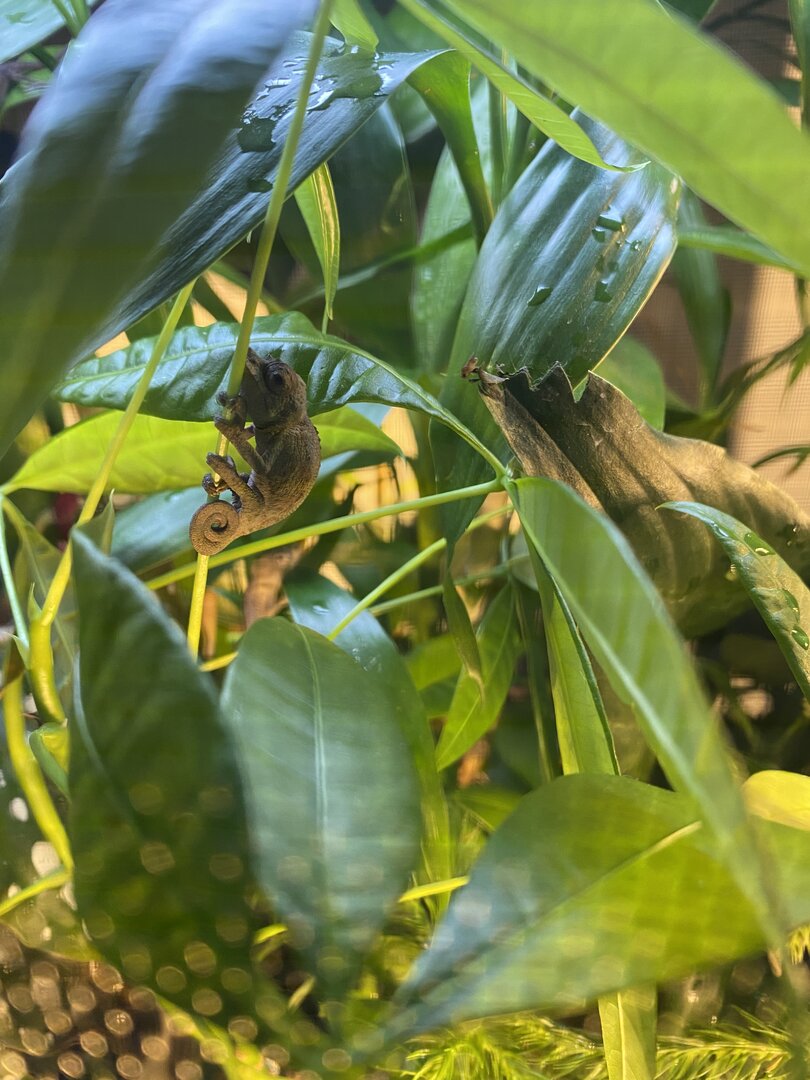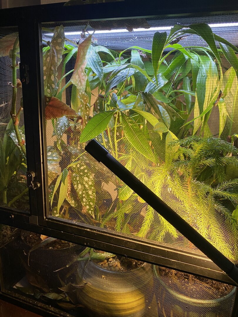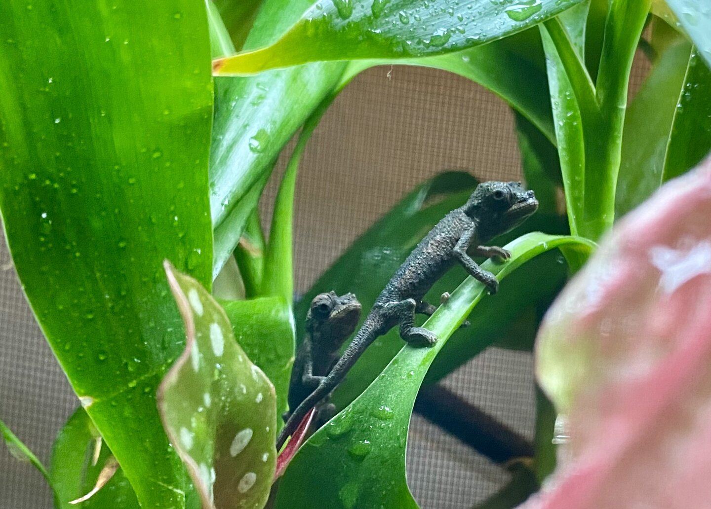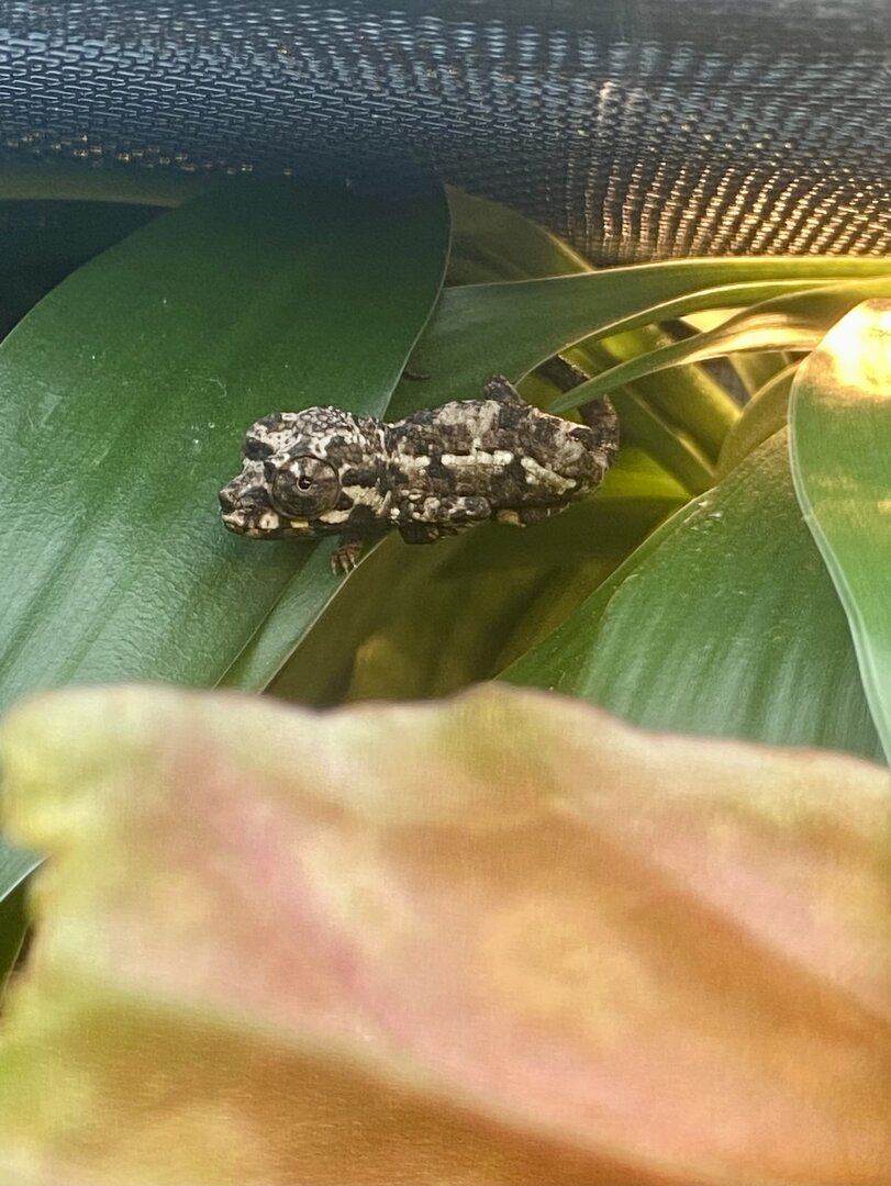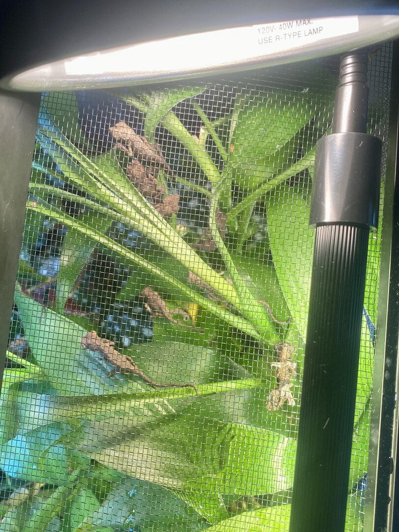 Jewel finally gave birth to her little ones, Thursday morning! 15 or 16 of them! (I lost count in the transfer out of mom’s enclosure) I found one glued to a branch by its face, almost dead because the sac had dried over its entire head. I wet it with a qtip and got it off and it pulled some from it mouth and down it throat. Ugh! Put him in with the others (in mom’s old set up, but tighter packed w all live plants) and just hoped for the best. I can’t get a solid count but I haven’t found any dead ones yet, I search the enclosure once or twice a day. Hand misting 3-4 times a day. 18” reptisun 5.0, 40watt nano heat light sideways for basking area up to 78-82 depending on exact spot (they seem to collect there, about half of them at a time. Ambient 68-74 Dusting FFF w calcium w/o d3… working on finding pinheads/other variety small enough. Right now they are all in a 12”x18x20high. And it seems like a jungle to them, they are so tiny! If anyone has helpful advice… how many should stay in that size space together between now and 4months old? Any idea at what age they piss each other off lol? They seem to be completely unbothered by each other right now. And has anyone tried butterfly set ups for babies? I have screen I could replace the top section with for lighting heat purposes. Looking for cost effective housing. Also as far as night temp humidity I’m in central west coast fl and they came just in time for our night temp drops! So happy about that. I’ve set them up right by the sliding door to my N/NE facing screened porch, on a tv table light weight type of stand so I can easily move them to either just inside or outside the door. Putting them outside each night. Humidity is 60 or so during the day and up to 100 at night. How cold is too cold?? On those nights I’ll keep them in but could crack the door to give them a cool night. They are inside if it’s getting warm during the day. If no advice just enjoy the cute pics
