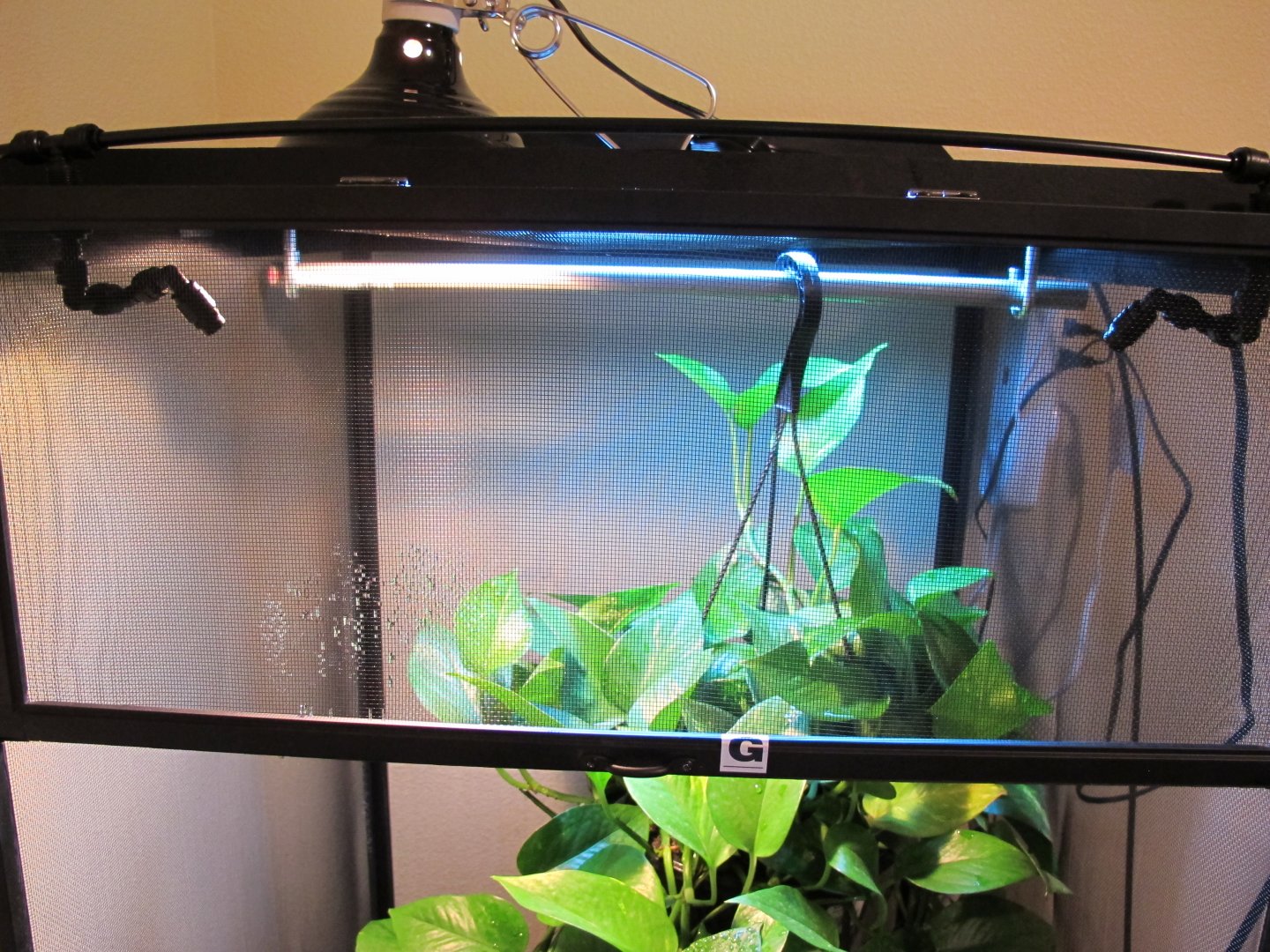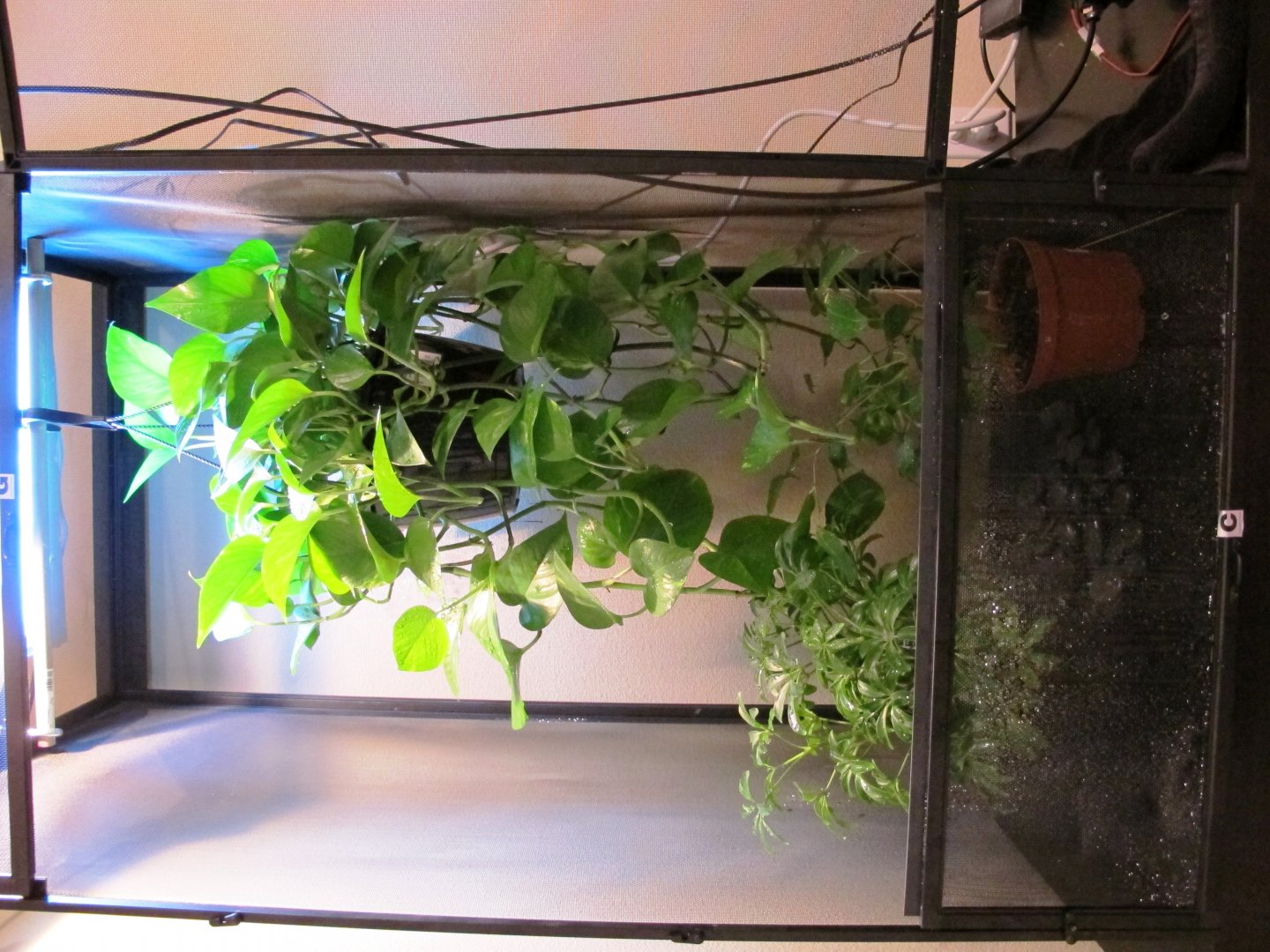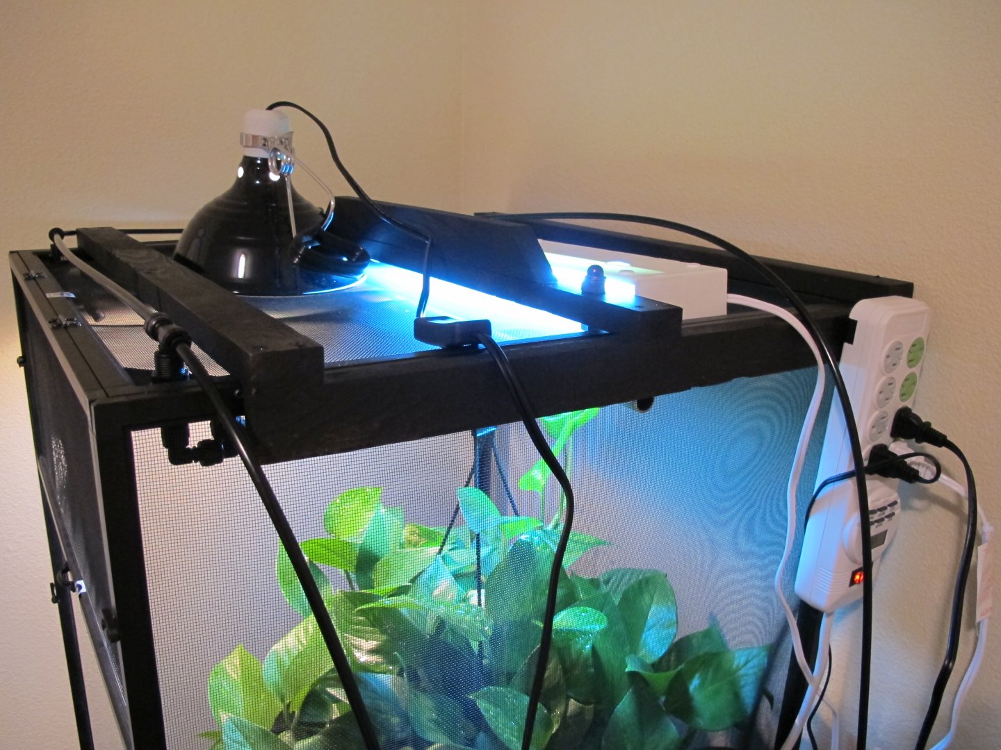 Over the past couple months I've slowly been putting together a 24x24x48 Jungle Hobbies enclosure for a Jackson's chameleon I plan on getting soon. I started off with three plants - a pothos, dwarf umbrella tree and ficus. The ficus wasn't in the best of shape when I got it and has been the slowest grower by far. I originally tried buying the enclosure from Josh's frogs, but they were out of stock. Therefore I purchased directly from MistKing and bought an Ultimate Misting System along with the enclosure. Unfortunately the shipping box for the enclosure arrived damaged, along with it contents. I contacted MistKing and they informed me they would not be getting anymore of the enclosures in the future, but offered me a substantial discount. I fixed the damage and went forth of the project. I really wanted to hang the pothos plant within the enclosure. After toying with some ideas I came up with something that worked perfectly. I made a bracing frame for the top of the enlcosure. Not only did it reinforce the fragile enclosure, but it provided me with a way hang the pothos. The frame sits on top of the enclosure and surrounds three sides. There are three slats of wood that also cross the top for additional support and an anchoring system. I also added a vertical tab so that I could attached the basking clamp light to, but it didn't work out in the end due to the angle. I ran two J-bolts through the middle slat and then ran a metal rod between the J-bolts. It's very stable. On top of the enclosure also sits a 60 watt basking light and an 18" Repti-Sun 10.0 florescent bulb. The enclosure sits atop of a cheap, two-tier Ikea table. Using a circle saw, I cut a hole through the top tier of the table. I then dropped a drain (the type you would find in a kitchen sink) into the hold a cut. It fit perfectly. I then attached a short PVC pipe onto the bottom of the drain. On the bottom tier of the table there is a 24x24 planting vat that collects the water drainage. Next on my list is to add sanded blasted oak branches and possibly driftwood. I already have the wood, I just need to cut it to size and place it within the enclosure. Also, I likely will be adding some realistic DIY vines. I saw a tutorial on YouTube that uses burlap and peat moss to create them and will be giving that a shot. Comments and criticism are welcome!