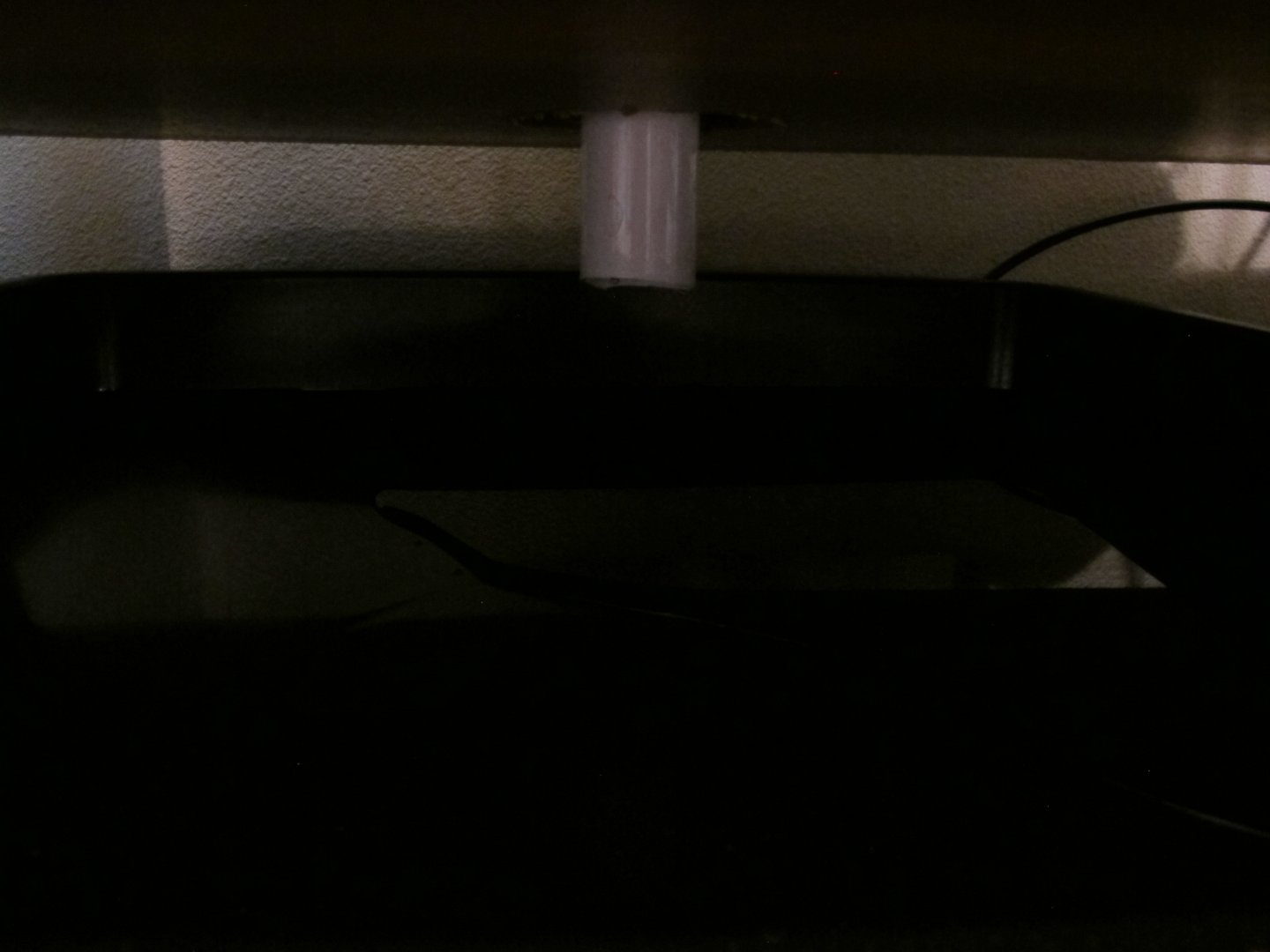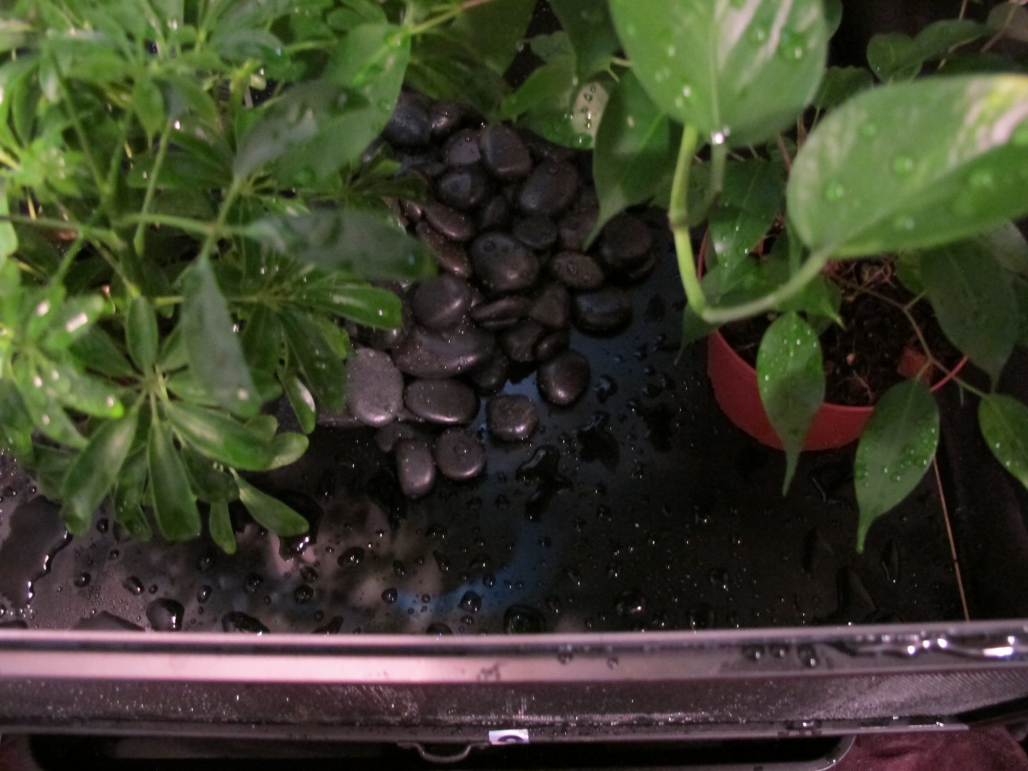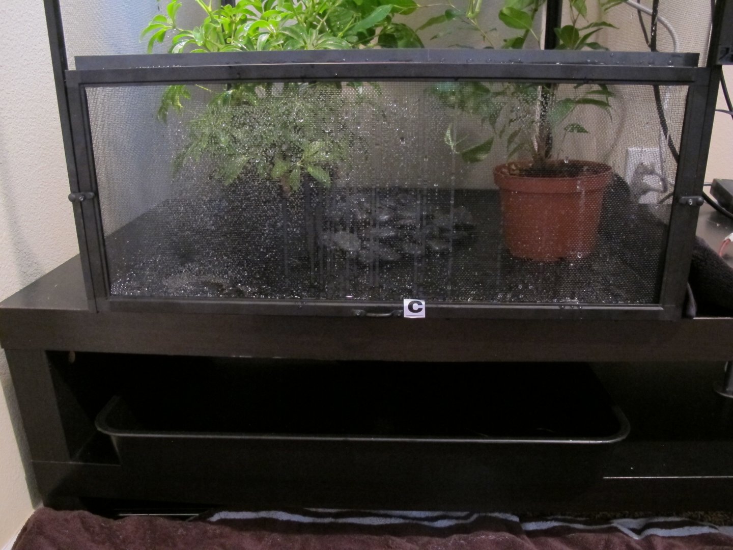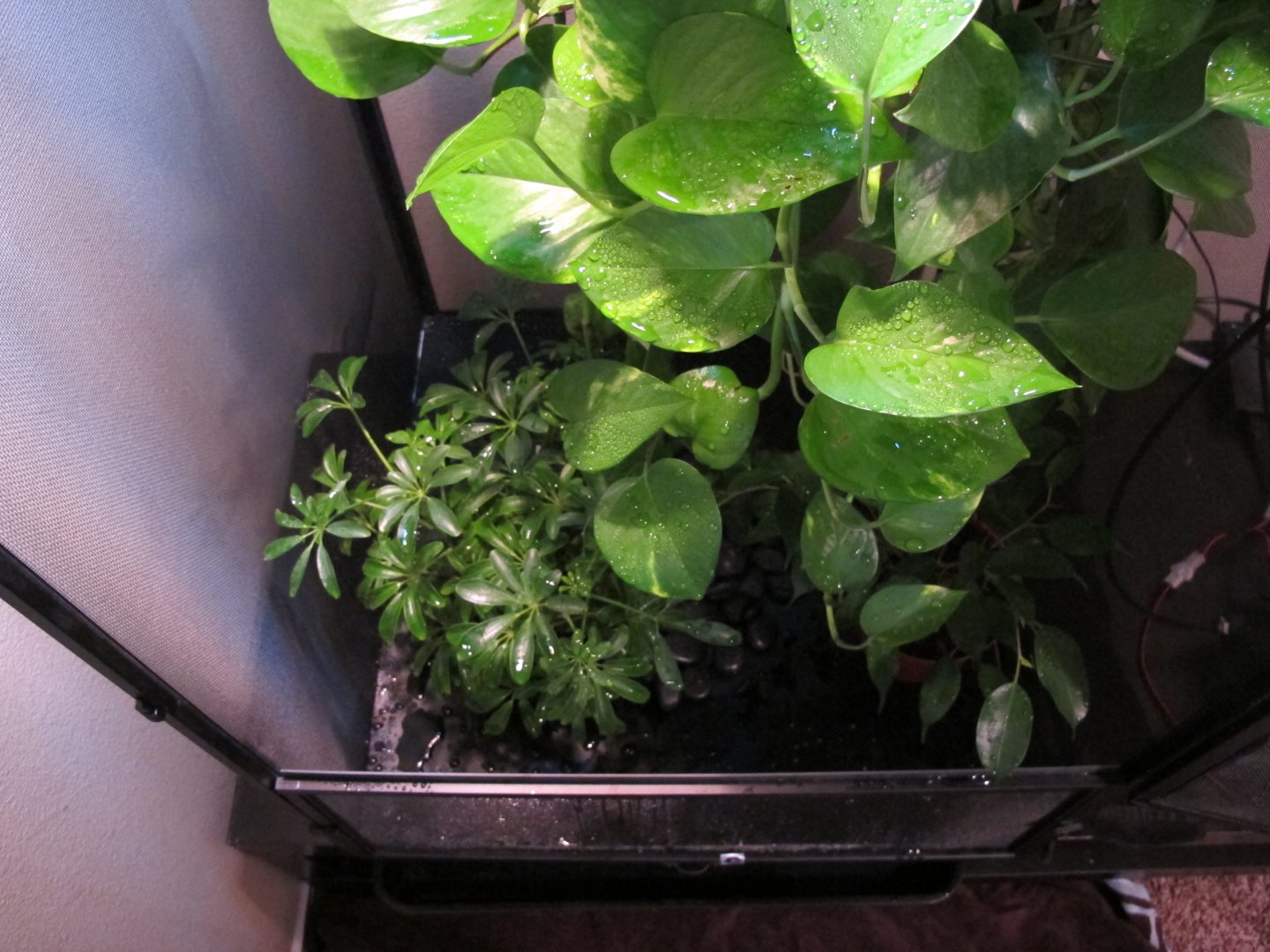 Over the past couple months I've slowly been putting together a 24x24x48 Jungle Hobbies enclosure for a Jackson's chameleon I plan on getting soon. I started off with three plants - a pothos, dwarf umbrella tree and ficus. The ficus wasn't in the best of shape when I got it and has been the slowest grower by far. I originally tried buying the enclosure from Josh's frogs, but they were out of stock. Therefore I purchased directly from MistKing and bought an Ultimate Misting System along with the enclosure. Unfortunately the shipping box for the enclosure arrived damaged, along with it contents. I contacted MistKing and they informed me they would not be getting anymore of the enclosures in the future, but offered me a substantial discount. I fixed the damage and went forth of the project. I really wanted to hang the pothos plant within the enclosure. After toying with some ideas I came up with something that worked perfectly. I made a bracing frame for the top of the enlcosure. Not only did it reinforce the fragile enclosure, but it provided me with a way hang the pothos. The frame sits on top of the enclosure and surrounds three sides. There are three slats of wood that also cross the top for additional support and an anchoring system. I also added a vertical tab so that I could attached the basking clamp light to, but it didn't work out in the end due to the angle. I ran two J-bolts through the middle slat and then ran a metal rod between the J-bolts. It's very stable. On top of the enclosure also sits a 60 watt basking light and an 18" Repti-Sun 10.0 florescent bulb. The enclosure sits atop of a cheap, two-tier Ikea table. Using a circle saw, I cut a hole through the top tier of the table. I then dropped a drain (the type you would find in a kitchen sink) into the hold a cut. It fit perfectly. I then attached a short PVC pipe onto the bottom of the drain. On the bottom tier of the table there is a 24x24 planting vat that collects the water drainage. Next on my list is to add sanded blasted oak branches and possibly driftwood. I already have the wood, I just need to cut it to size and place it within the enclosure. Also, I likely will be adding some realistic DIY vines. I saw a tutorial on YouTube that uses burlap and peat moss to create them and will be giving that a shot. Comments and criticism are welcome!