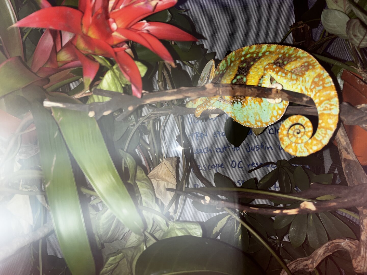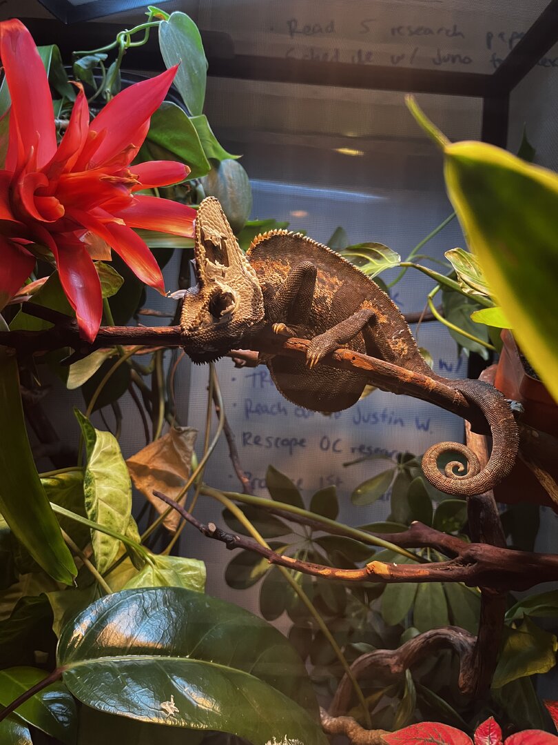 - Your Chameleon - Veiled chameleon, male, guessing ~1-1.5 years old? Wild caught in Florida about two weeks ago, mailed to my home on the west coast ~1 week ago.