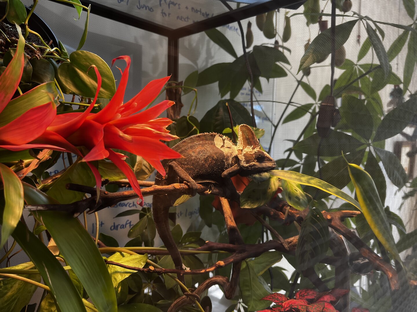 - Plants - Tons of live plants, including: pothos, prayer plant (maranta), bromeliads, two schefflera, snake plant, one philodendron. I built a frame inside the cage so there is nothing touching the floor. There's a tray on the bottom that I can pull out to rinse and drain. There's also manzanita branches in there that I collected, sanded, washed, sanitized and dried.