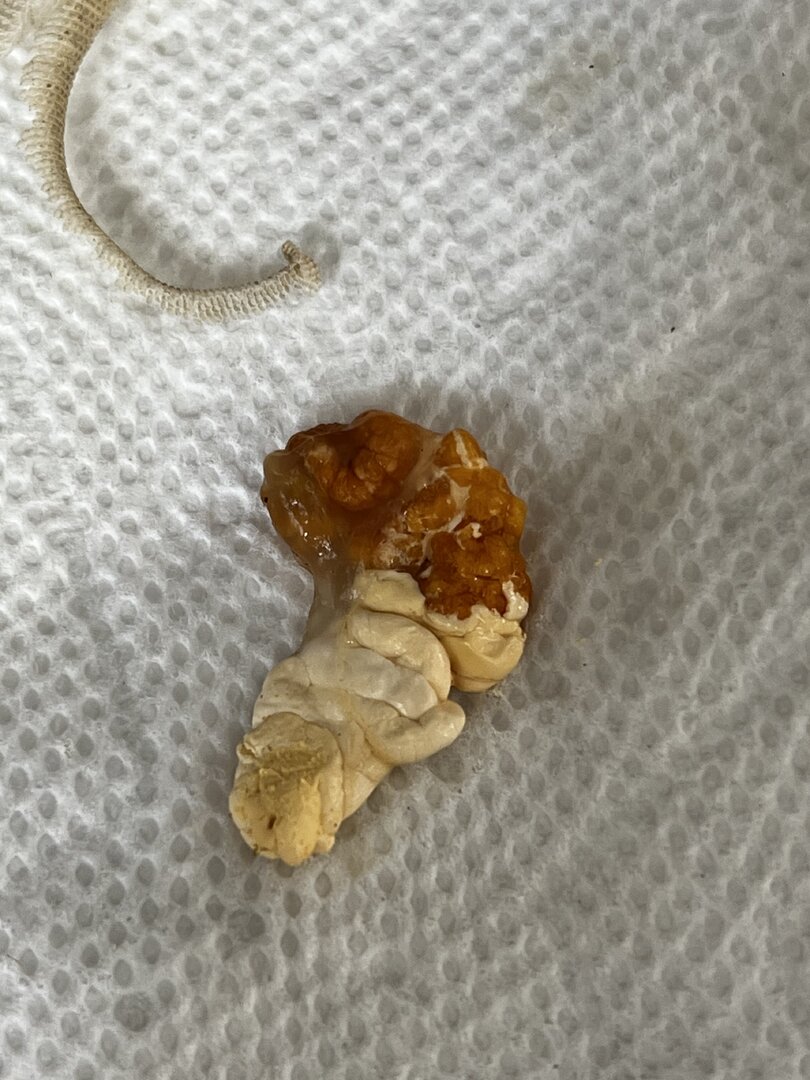 - Fecal Description - Not tested for parasites yet but plan to do that in about 2 weeks when he's acclimated to his new home. No feces today but gelatinous and crunchy orange urates. Last poop was on Friday.