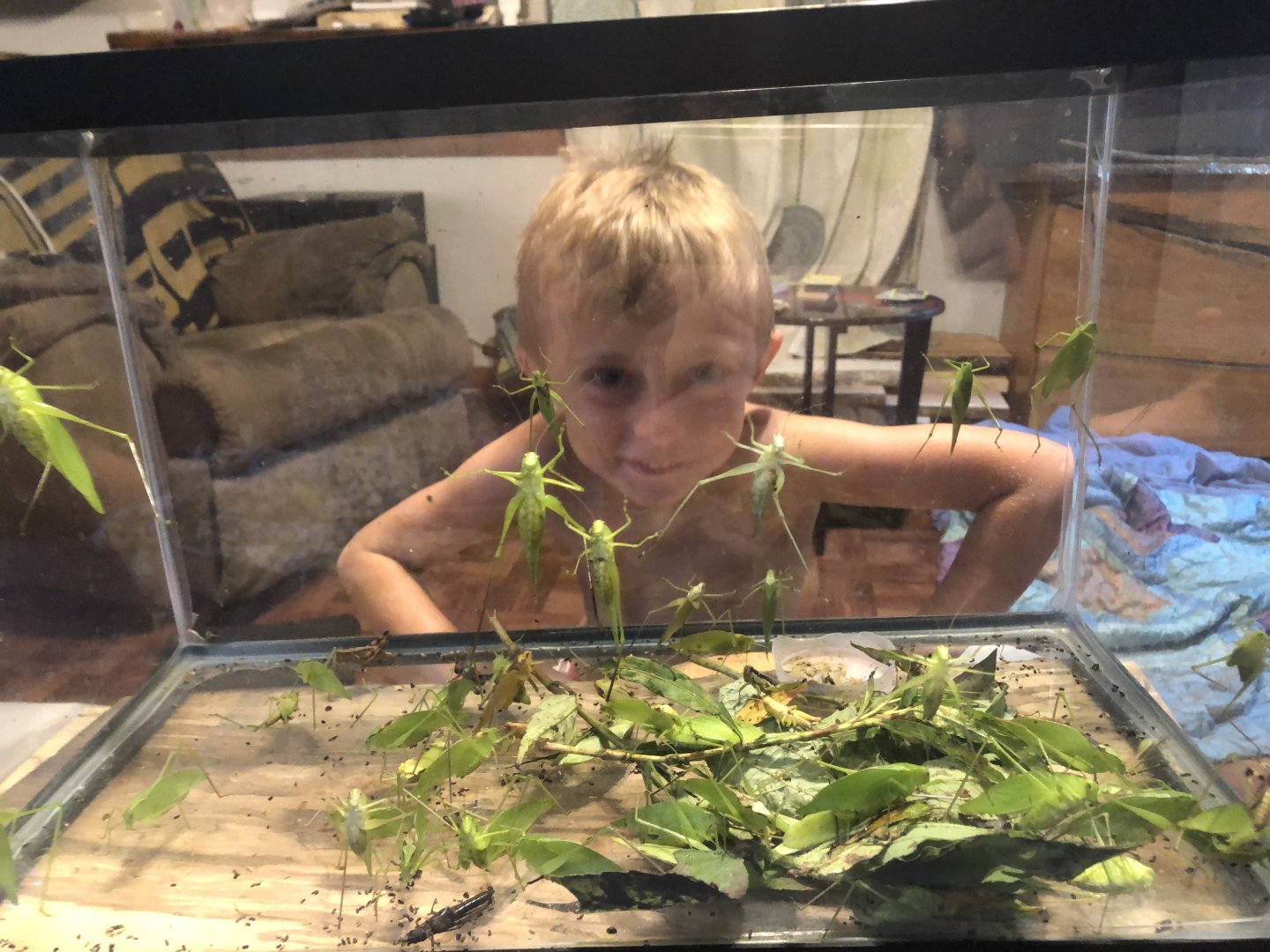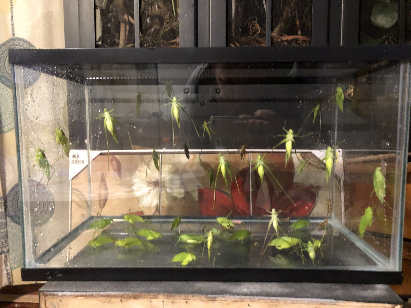 Katydid nymphs are hatching right about now! Little katydids turn into big katydids that hopefully make small katydids again... so go outside and catch some! I found two without really looking for them on my raspberry plant’s leaves.