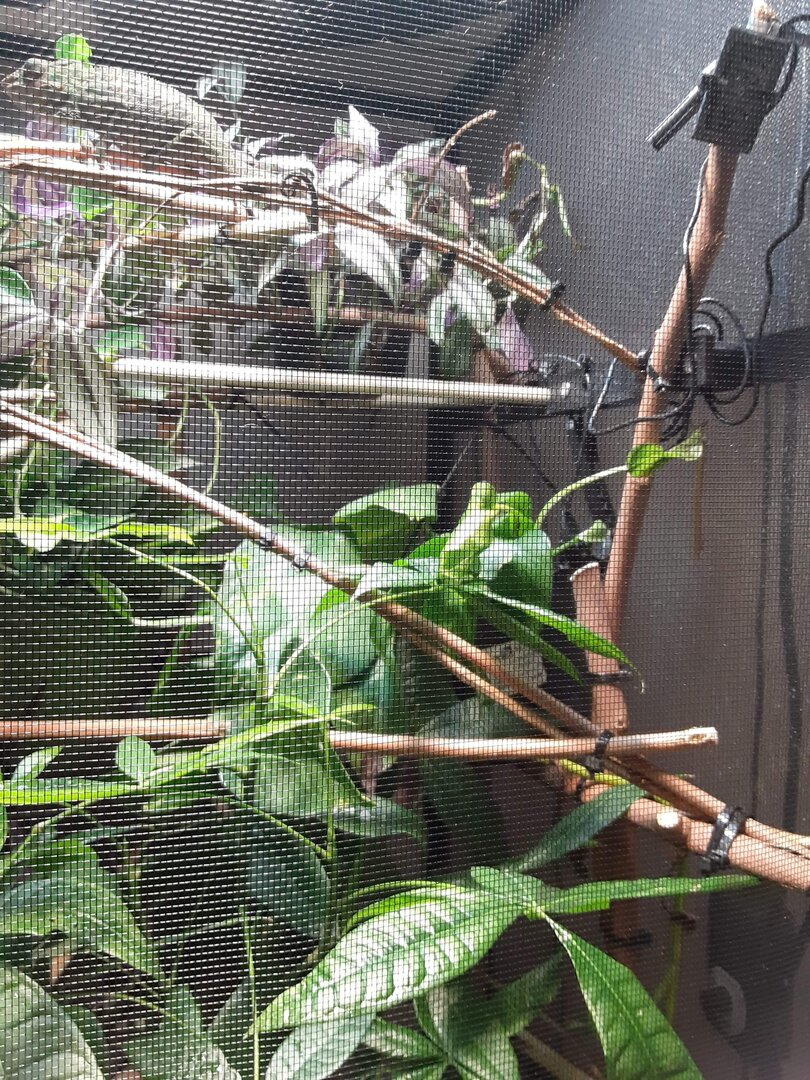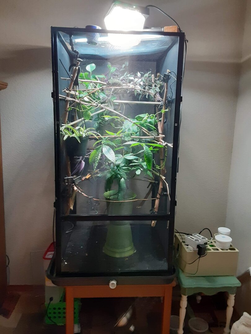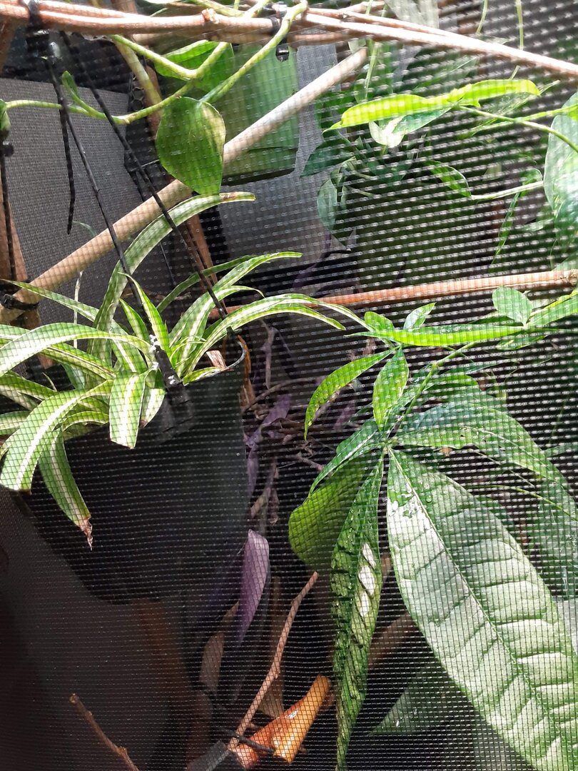 Today, Beau was able to see my fiance sitting on his floor seat in front of the TV (Beau‘s cage is located several feet away from the TV, but is along the same wall). It seemed to make him nervous and he spent some time climbing back and forth between the plants in the middle and the highest branch in the cage. It wouldn’t have been noise bothering him as my fiancé was playing a game on mute (things are very low-key out here. Noise kept to an absolute minimum, TV is mainly only used for games and is kept on very low volume or muted when it is on), so it’s got to be the sight of my fiancé that my chameleon was unnerved by. His cage isn’t under planted, but I feel like coverage could be better (my pothos and tradescantia zebrina at the very top could stand to grow out some more). How do things look currently? Any suggestions where I might add more plants toward the top?