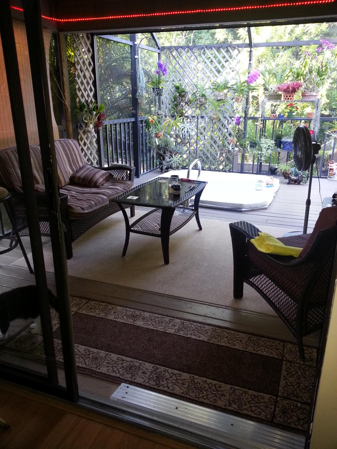 We live in SW Florida and we were thinking about having him live on our patio. I attached a photo for reference...basically the love seat on the left, he would be next to that and the hot tub. I would be removing the lattice work and plants and put his diy 2x2x4 cage there. I have a spectacular Pothos Devil vine that I have in a hanging basket. I have strong but thin wire that will hold the plant fine and I was planning to put a hook in our ceiling and run it inside of his cage then hang the basket from that. I have all kinds of driftwood & mopani pieces that I will be adding to the cage and some vines as well. I will just be hand misting at first. It gets lots of sun but I am now being told I will still need lights. I have read lots of different things here and other places and even talked to a few well known rep stores. Thoughts? Thanks for any input!!
