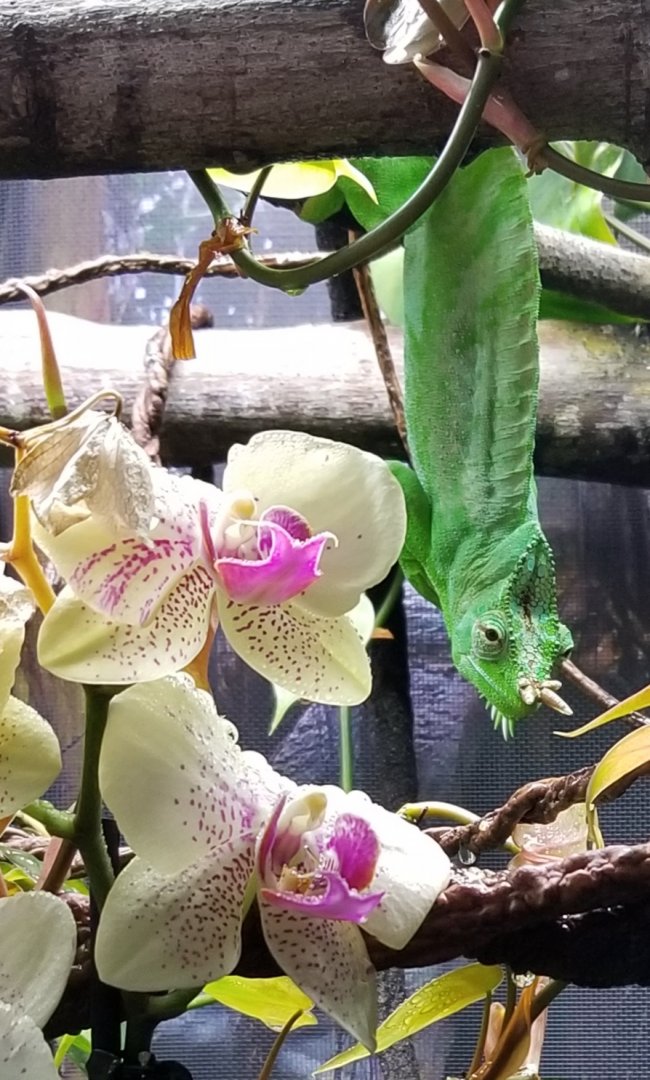 My fiancee just sent me a photo of our chameleon shooting his tongue at her anytime she walked by his cage. We keep his feeding schedule as regular as possible and today is his normal feeding day and we normally feed between 9-10am so I can only imagine that he has become conditioned to this schedule and is getting excited. He apparently wasted no time picking off his crickets when my fiancee opened the cage.