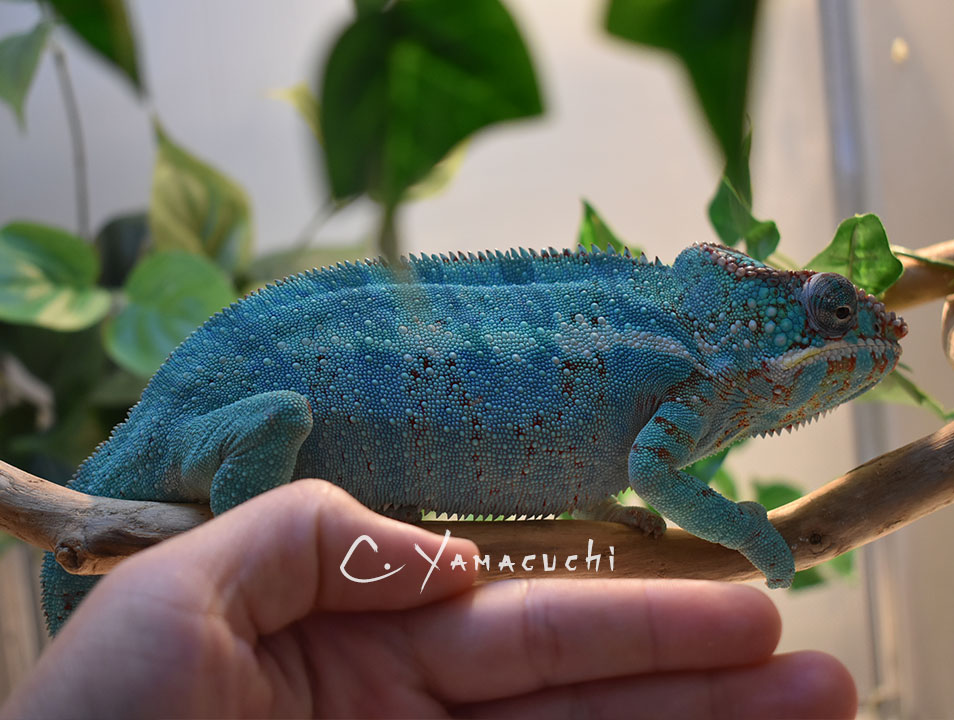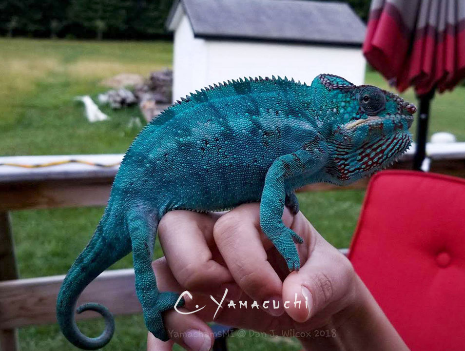 Bred from a female from wild lines as you can see from the speckles of red! Son of Nosy be from Jennifer Betz, vet of Chamelicious Chameleons and daughter of female from F1 breeding of imported Nosy be male. Born August 2017 $275 plus shipping :) https://yamachams.com/products/male-nosy-be-panther-chameleon
