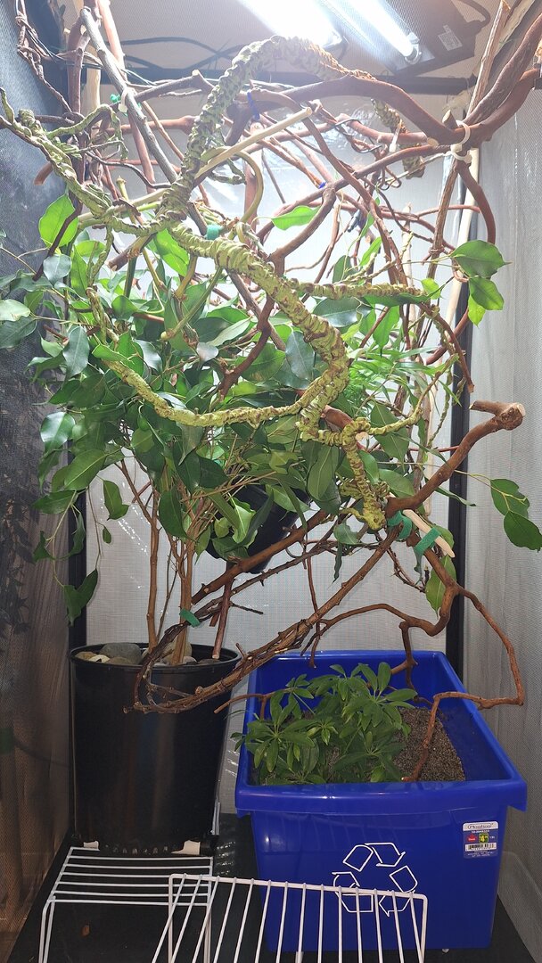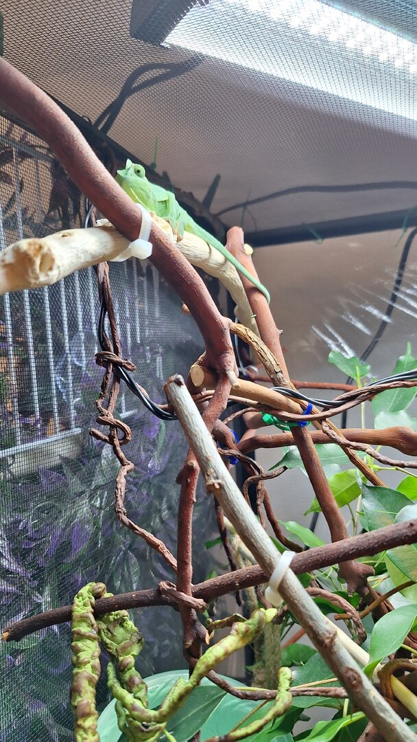 I've been silently reading as many posts here as possible to be as well informed as possible about my new little friend. I've always wanted a chameleon and came across one who stole my heart a few months ago. so, I made the leap and put in the deposit, went home and geeked right out reading and buying everything to make a happy home for her. Live plants, a large reptibreeze cage, went on a stick collection adventure with my dog, bought the UVB bar/basking light, misting materials... You know how it is, the list goes on. And I took her home two weeks after getting her cage set up.