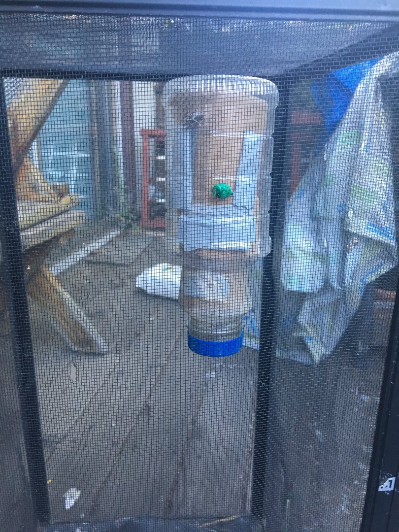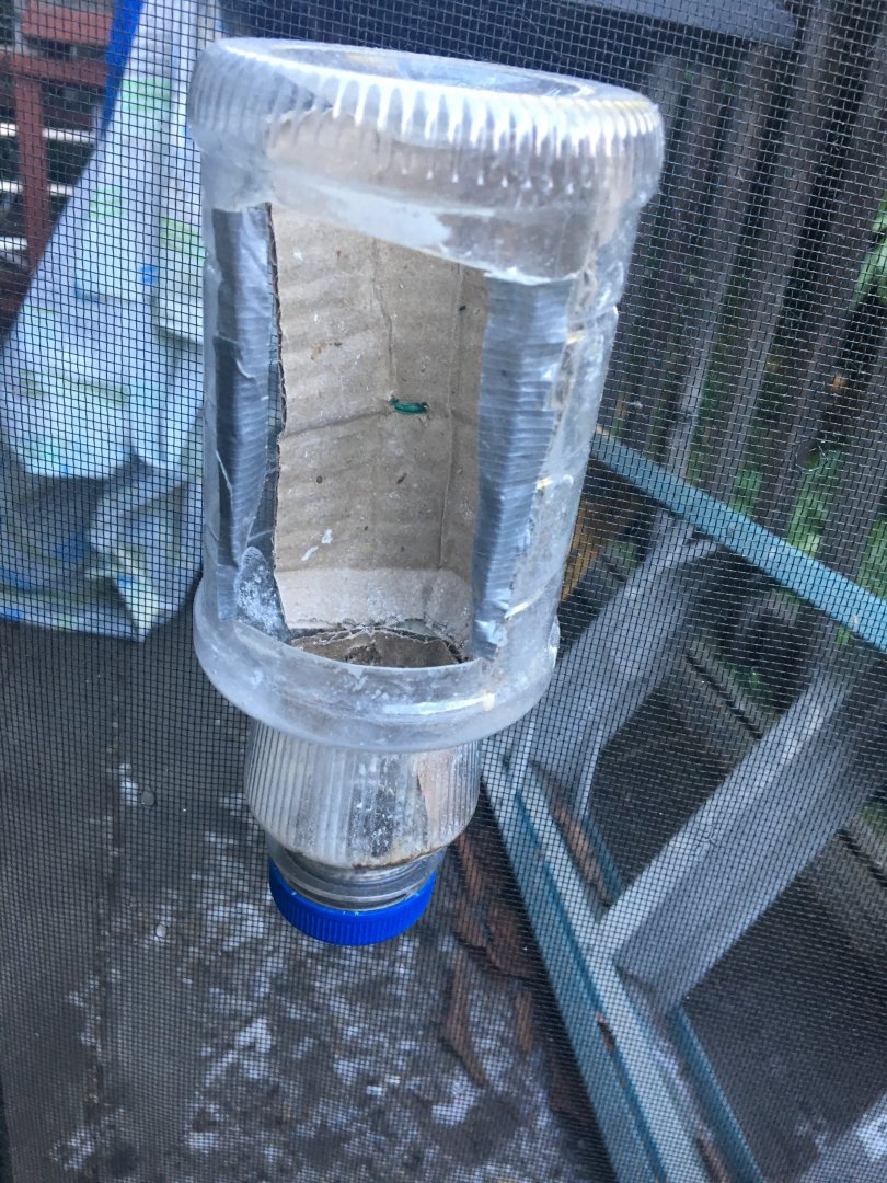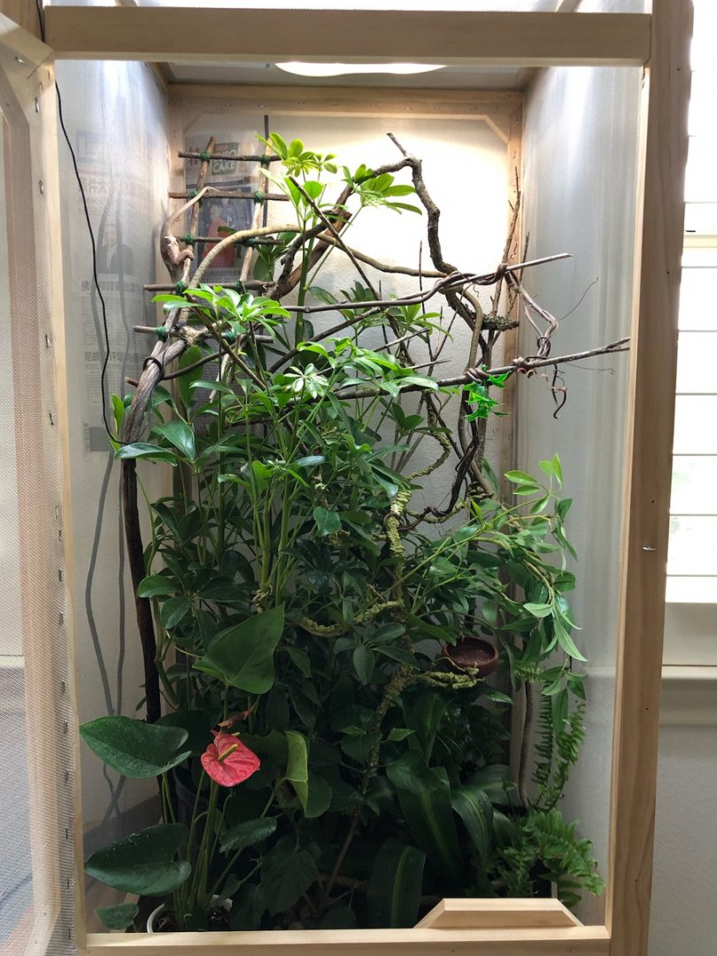 Get a sunny D bottle cut out a 3 inch wide 4/5 inch long square for the side that faces IN the cage and out card board on the side that you can see so the crickets can go on the card board. It lets the chameleon see the food without seeing you and you’ll hear a little tapping sound when he gets a cricket because his tongue will hit the back of it