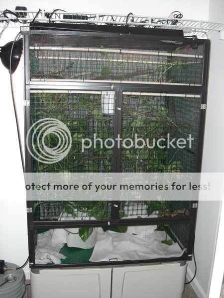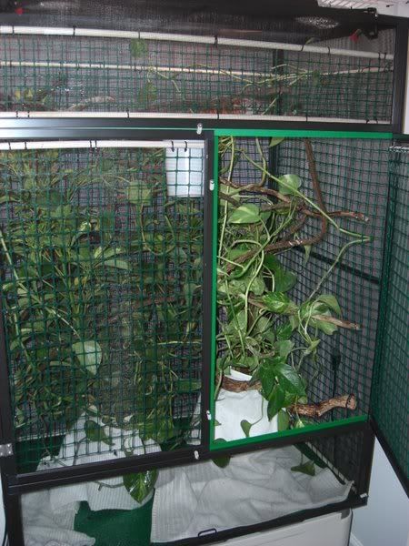 JUst finished Leon's new setup. Marty from Habitat Designs custom made this screen cage and it rules! 48" tall, 24" deep and 36" wide. It has a Mist King misting system, ESU 36" hood running a Reptisun 10.0 tube and 2 slimline Verilux 25w neodyme bulbs for light (thanks for the tip Catherine), themostat conroled baskin lamp with a ceramic heat element. There is a 6 year old Pothos with long fraking vines and a brand new Scheff that is about 3' tall. White on the bottom is towells. Not sure how the mist will fall yet and no drainage strategy yet.
