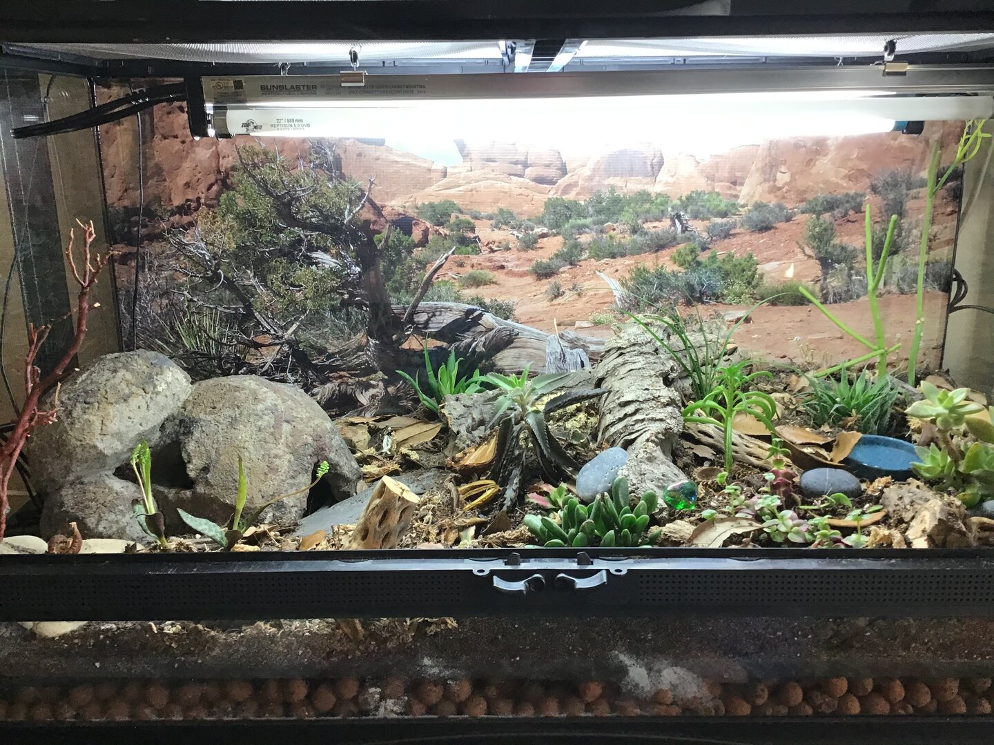 Yes, my tanks are kept quite dry. I have 6500 k sunblasters in there for the plants and they are all growing almost too well. The fire stick is growing very well...lots of new branches...but no color has returned. I haven’t fed it ever, so maybe it needs a bit of fertilizer. I haven’t really looked up the specific care for it. Guess I probably should.Ah they need to dry out completely between waterings, as in bone dry. As for the orange color, you will likely need a jungle dawn led or other very intense light to get the orange colors back.