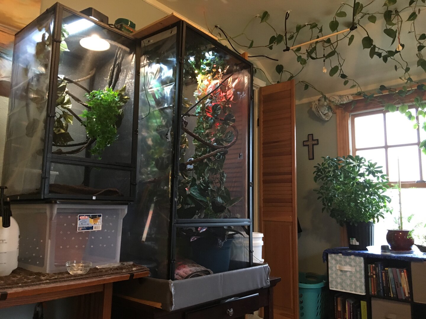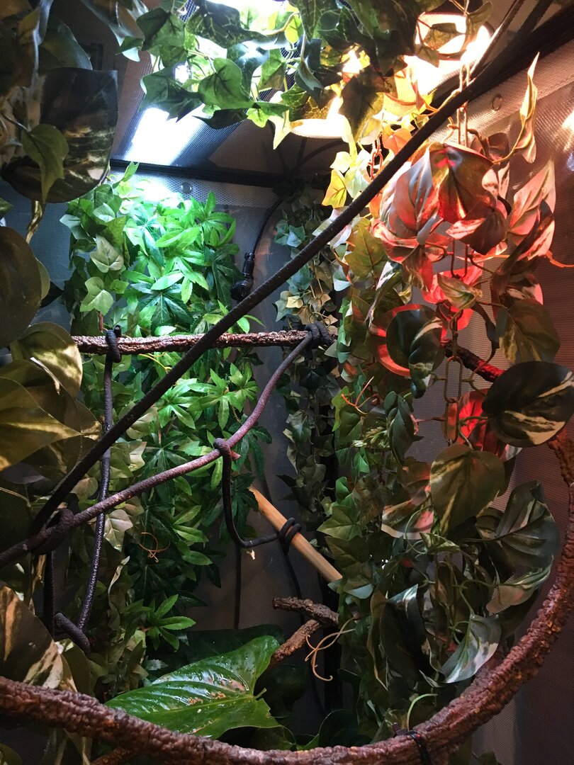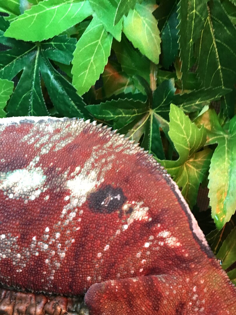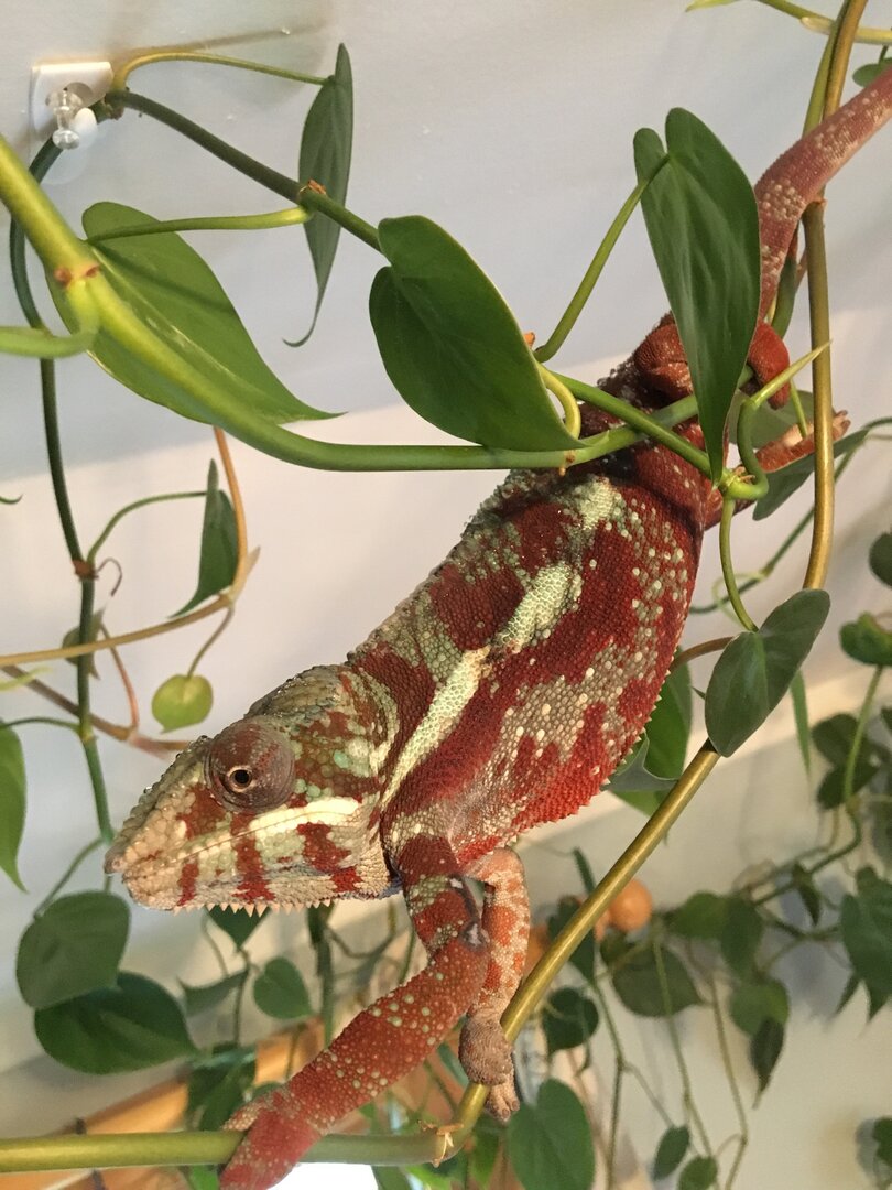 Hello guys, my 11 month old tamatave has been acting off. Lately he has been consistently dark in coloration and moving exceptionally slow. Whenever he’s on a branch or my forearm he’s sluggish and not attentive. Unfortunately he will only eat super worms. He hasn’t wanted out of his cage which is odd. I did get a veiled chameleon, and his cage is right next to my Panthers. There are two shower liners keeping them from seeing one another, is that sufficient? They both get multivitamins every other week and calcium with every meal. My panther only eats every few days but still gets fat, he has a very slow metabolism. I have also adjusted his lighting to be 9 inches away. His spine keeps getting burned, and at this distance the heat is barely touching him, I’m confused. Does anyone know why he might be so lethargic, Or what his spikes keeps deteriorating? He has a misting system that comes on every couple hours.