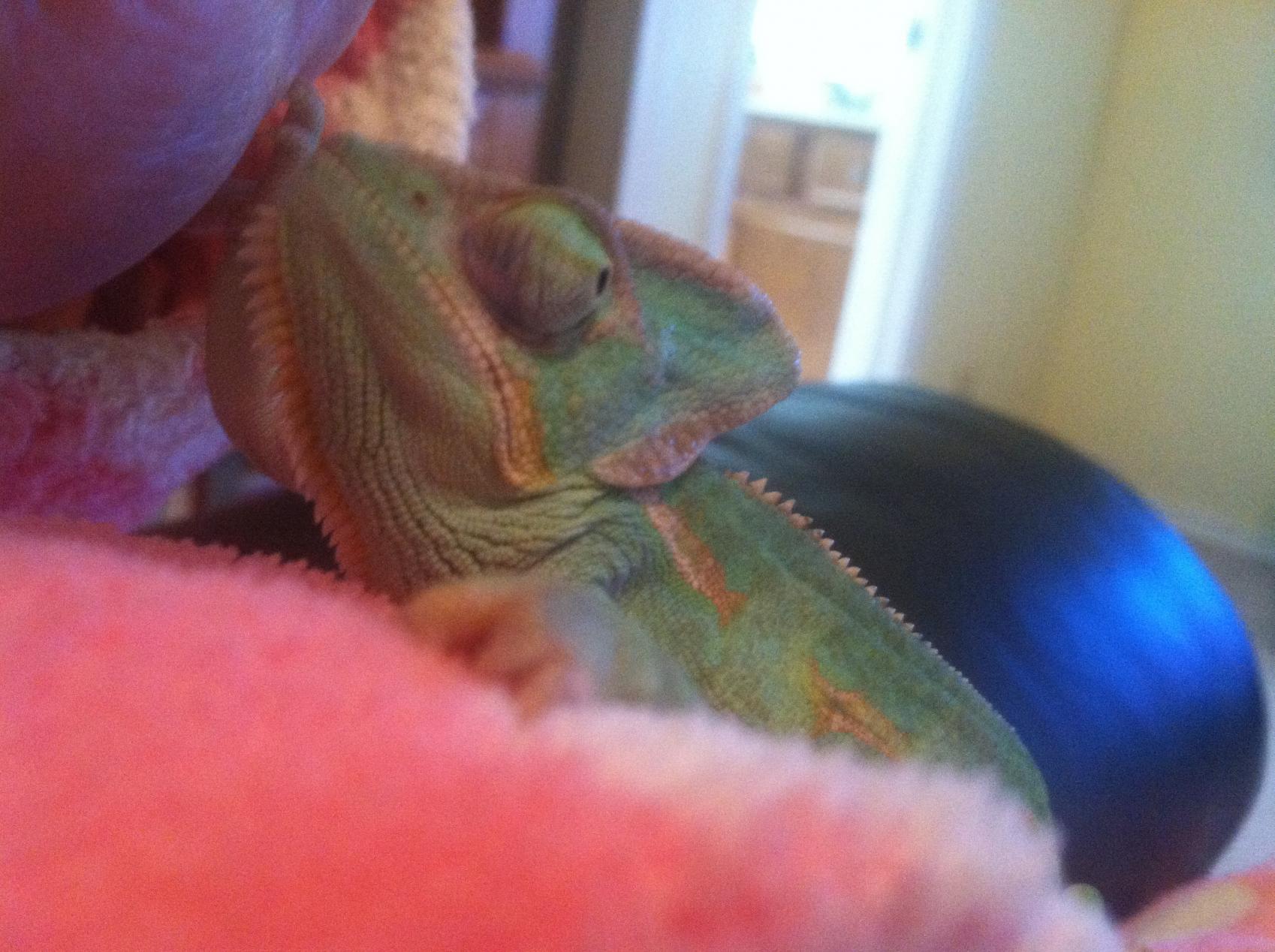 Heyo again, my veiled's right eye is light purple towards the bottom. This is only one eye and his left eye seems fine.