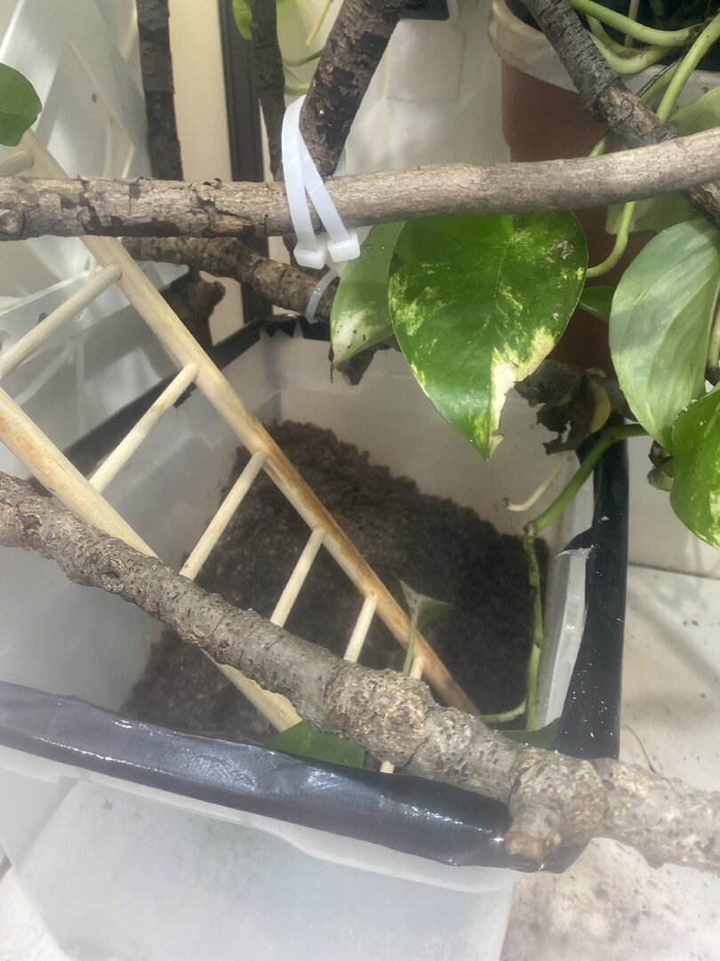 okay nowww we’re getting into the stuff I don’t understand. today she had her normal morning routine. lights went on at 9 and she went up to bask. a sheet has been up and I didn’t interfere today at all. at noon she heads downward because it was misting and she didn’t like it lol and THEN FOR ANOTHER HALF HOUR, she sits above the bin on a branch contemplating whether to go in or not. She finally does and has been in there ever since (3:30pm est), creating a hill, not a level plain, and sometimes, covers in the wrong direction which I don’t understand. She’s even looked like she wants to come out, had her hands on the edge, and has even fully stood on the edge of the bin, and then decided to go back in. idk if she has overactive hormones or smth but I feel like for her own health so she doesn’t get exhausted, I should just take her out. if she wanted to do it that badly wouldn’t she have started immediately in the morning? it seemed like an “oh this is here, guess I gotta do it” type of thing after the pot problem. tbh none of it makes any sense.