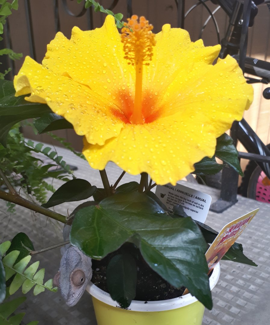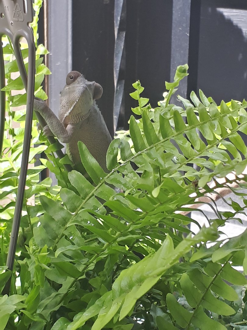 Chameleon approved! :love: Lily checking out her hibiscus, and her Boston fern. She's getting very bold and comfortable with me, and readily hand feeds now without any hesitation. No more karate chop hands, either! I feel like I've made good progress this week in terms of establishing trust. :)