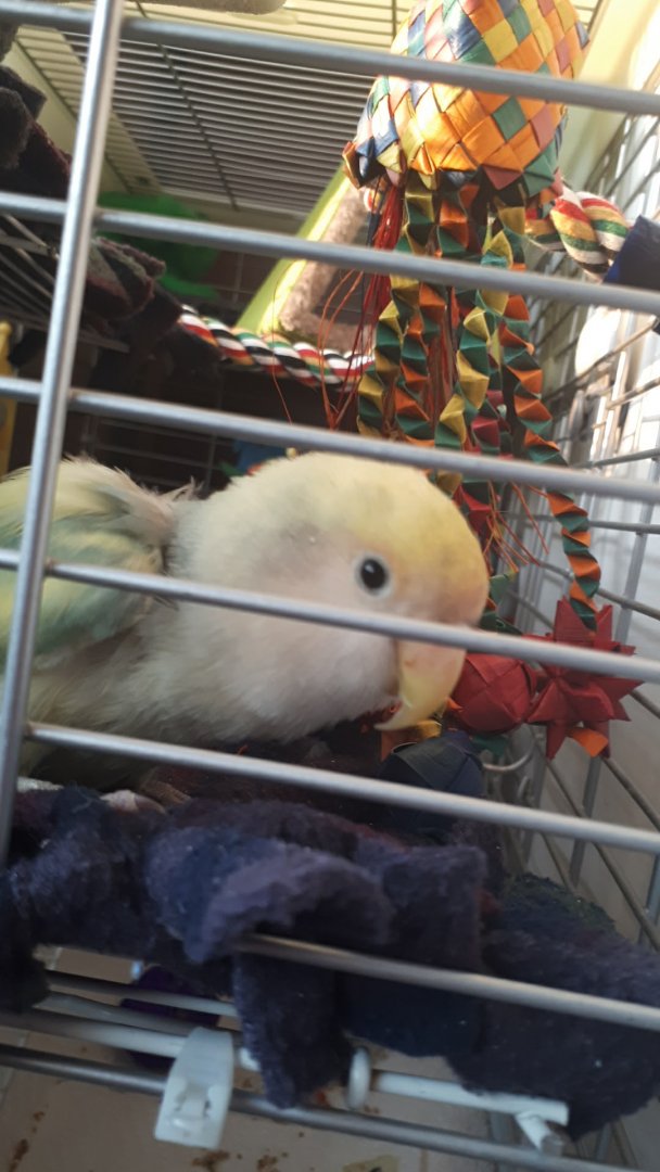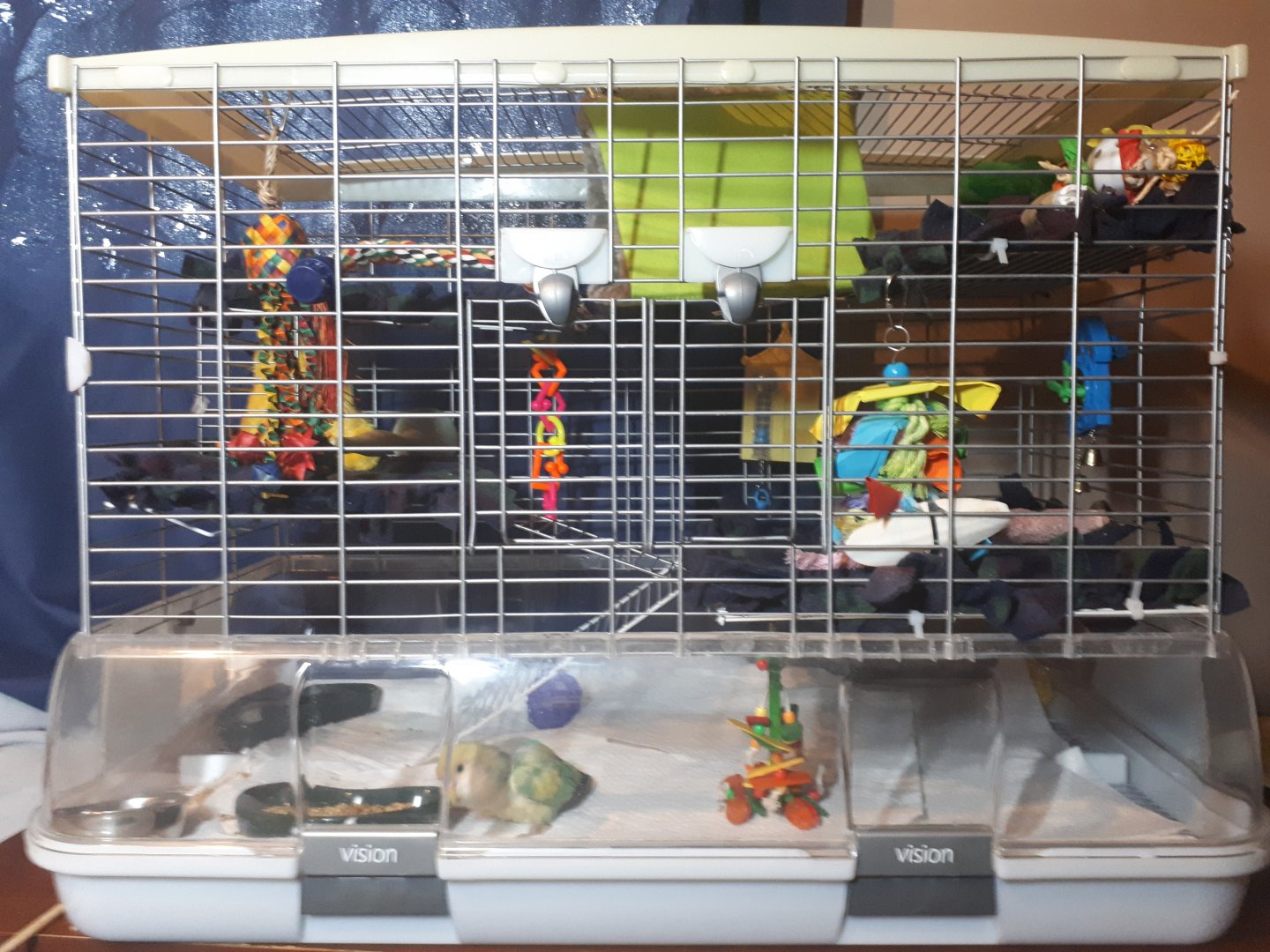 Lucy aka Lucifer, and her modified cage. Due to her balance, she couldn't perch well and often tipped over, so she had platforms with soft fleece pads under any perches and ladders.