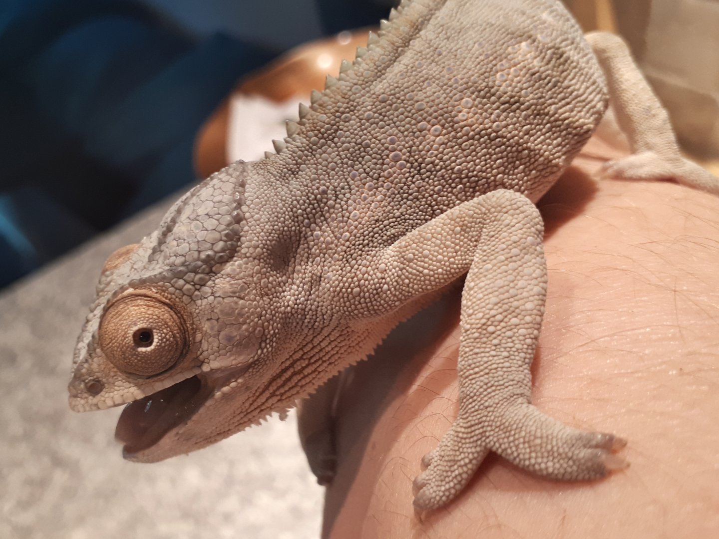 I honestly expected to take a couple steps back in terms of trust after a vet visit... but Lily was really awesome! She got some sun at the coffee house beforehand, and we even swung by the mom and pop pet shop to grab some hornworms. I was incredibly impressed by how well Lily handled it all. The employees wanted to meet Lily, and I opened her box for them to take a quick peek. To my surprise, Lily readily came out on her own! She maintained nice calm colors and mentation (she only performed one chameleon salute/slight darkening when the male employee came over), and readily ate a couple BSFL and a hornworm from my fingers with an audience!
