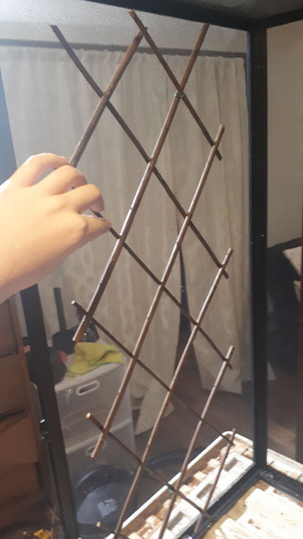 The plan right now is to have a foam background on the back panel, and willow expanding trellises on both sides. First step was to get the eggcrate and trellises cut to size, and let me tell you: those trellises were a real pain in the rear end to work with! They were poorly constructed, and I essentially had to keep them together with strategically placed twist ties. They're ugly, but I figure I'll replace the ties with superglue when it's time to actually install them, if they bother me. Please excuse the terrible quality of the first couple of pictures!