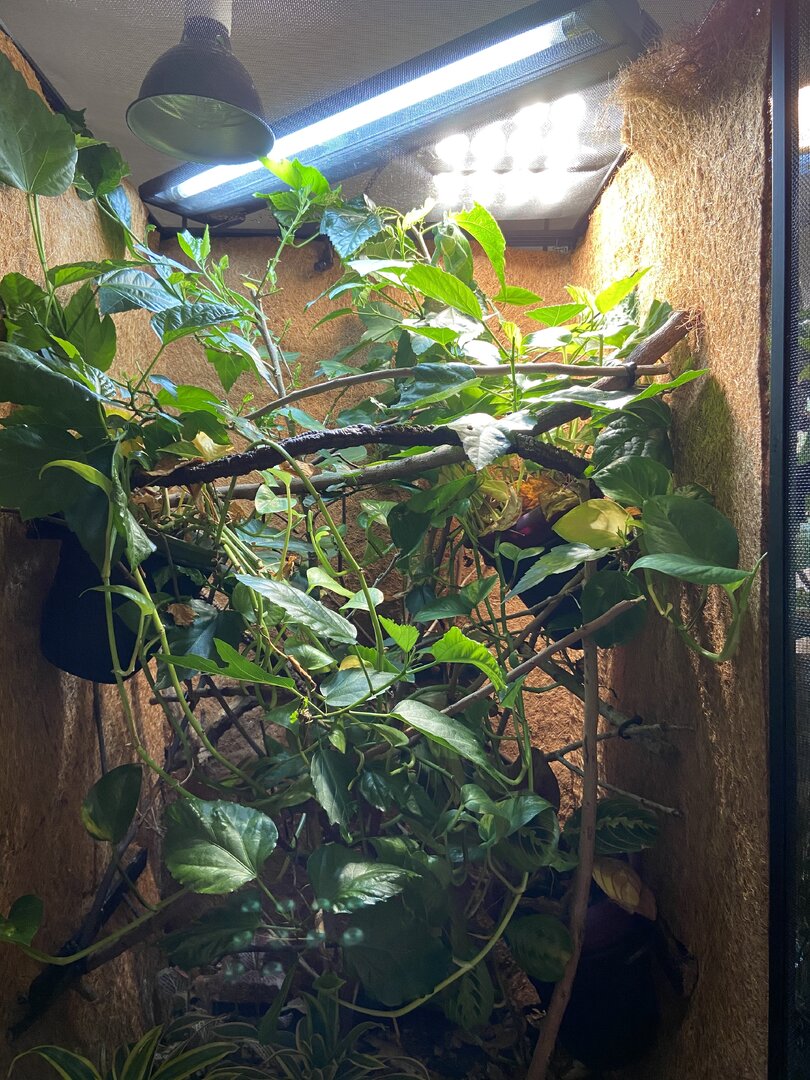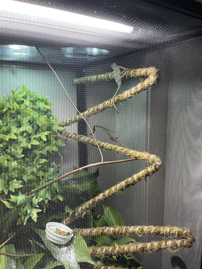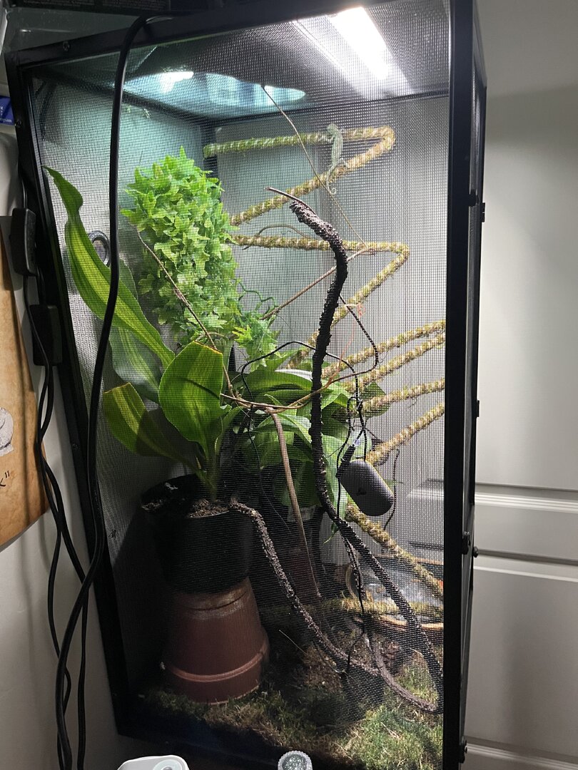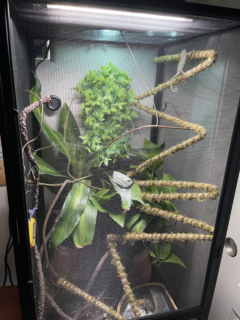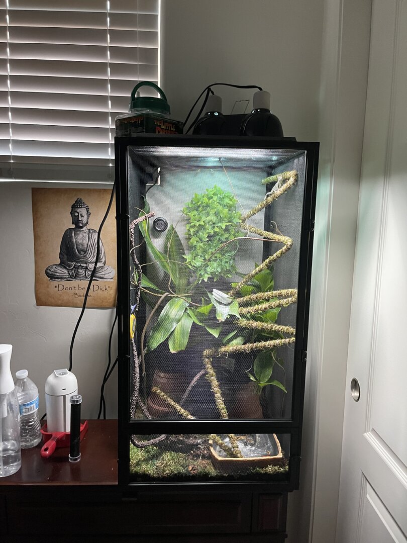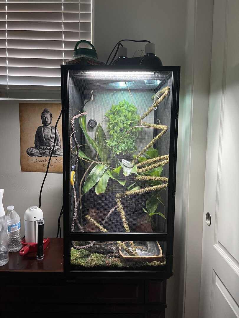 Iāve seen her drinking maybe three times but whitish tip to excrement so I know sheās drinking. I have a dripper that I turn on a couple times per day for 10-15 mins and mist by hand before lights on, once during the middle of the day and again about an hour before lights out. Itās super dry here so if I see the humidity level dropping into the 20s Iāll put in a small humidifier for 30 mins or so to bring it back up.