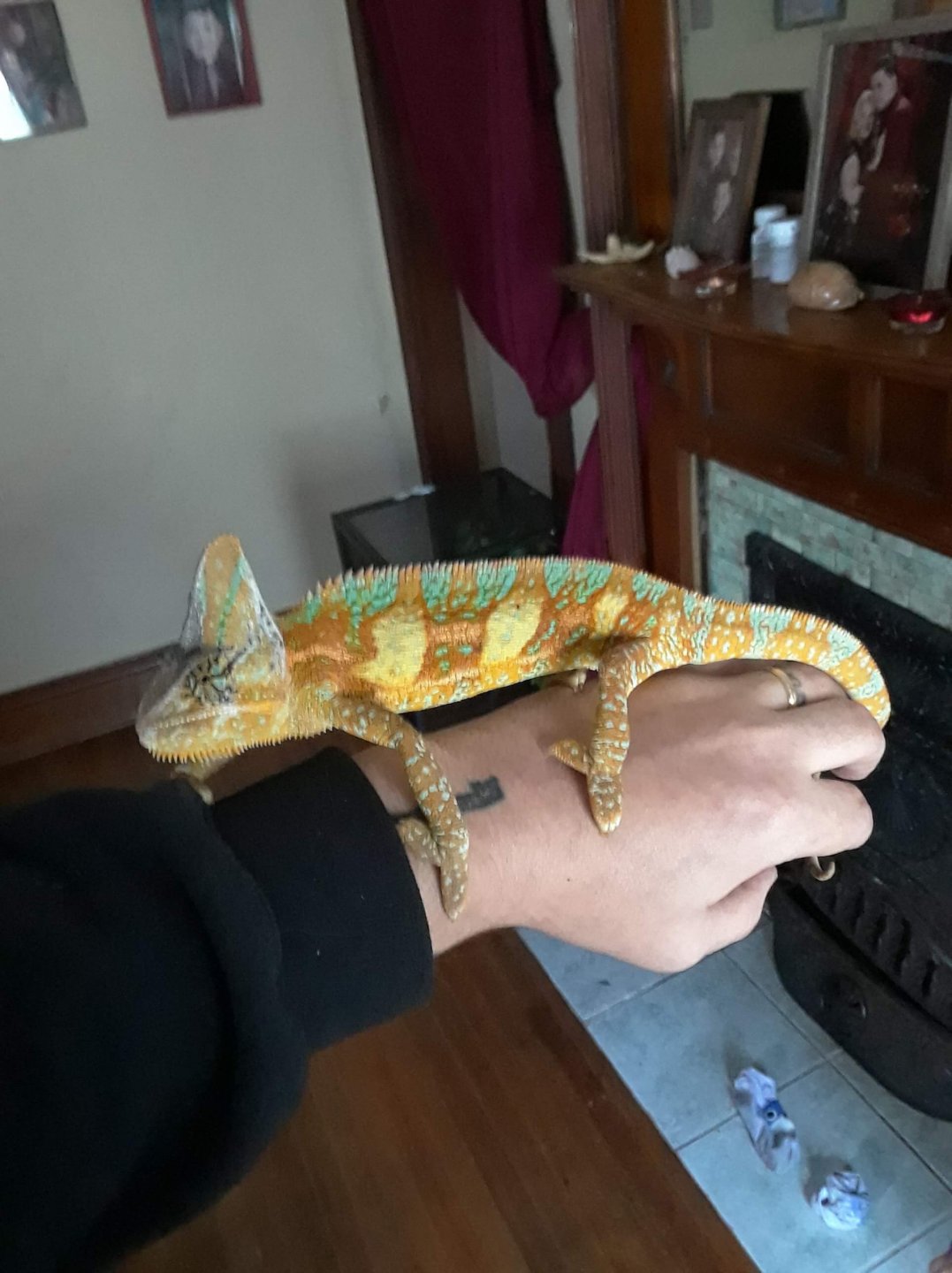 Reminds me of a wildcaught veiled that made it to the states, Although this one isn't as yellow and orange. I think he was named storm. Do a search for him.
