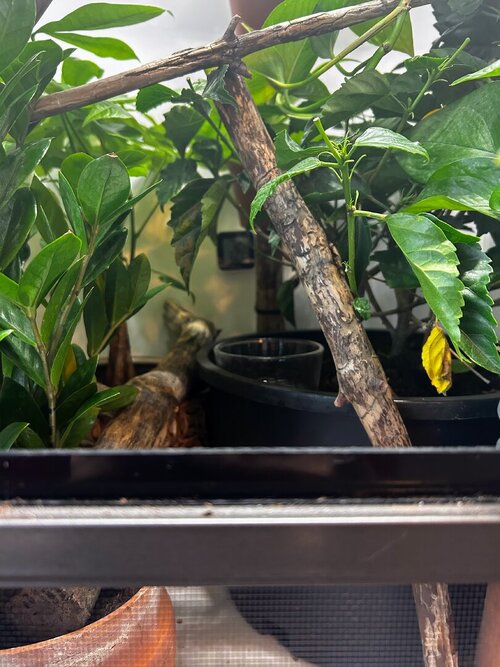 I’m still trying to figure out the basking temperatures and could use advice on what I should be measuring here. If I measure the top branch when the basking light is at its brightest it's about 75, if I put my hand there to simulate the back it goes to about 85 but if I leave my hand there for a bit it gets about 90. I would assume that would happen as my skin temp is probably warmer but maybe I'm overthinking it either way, suggestions would be great there too.